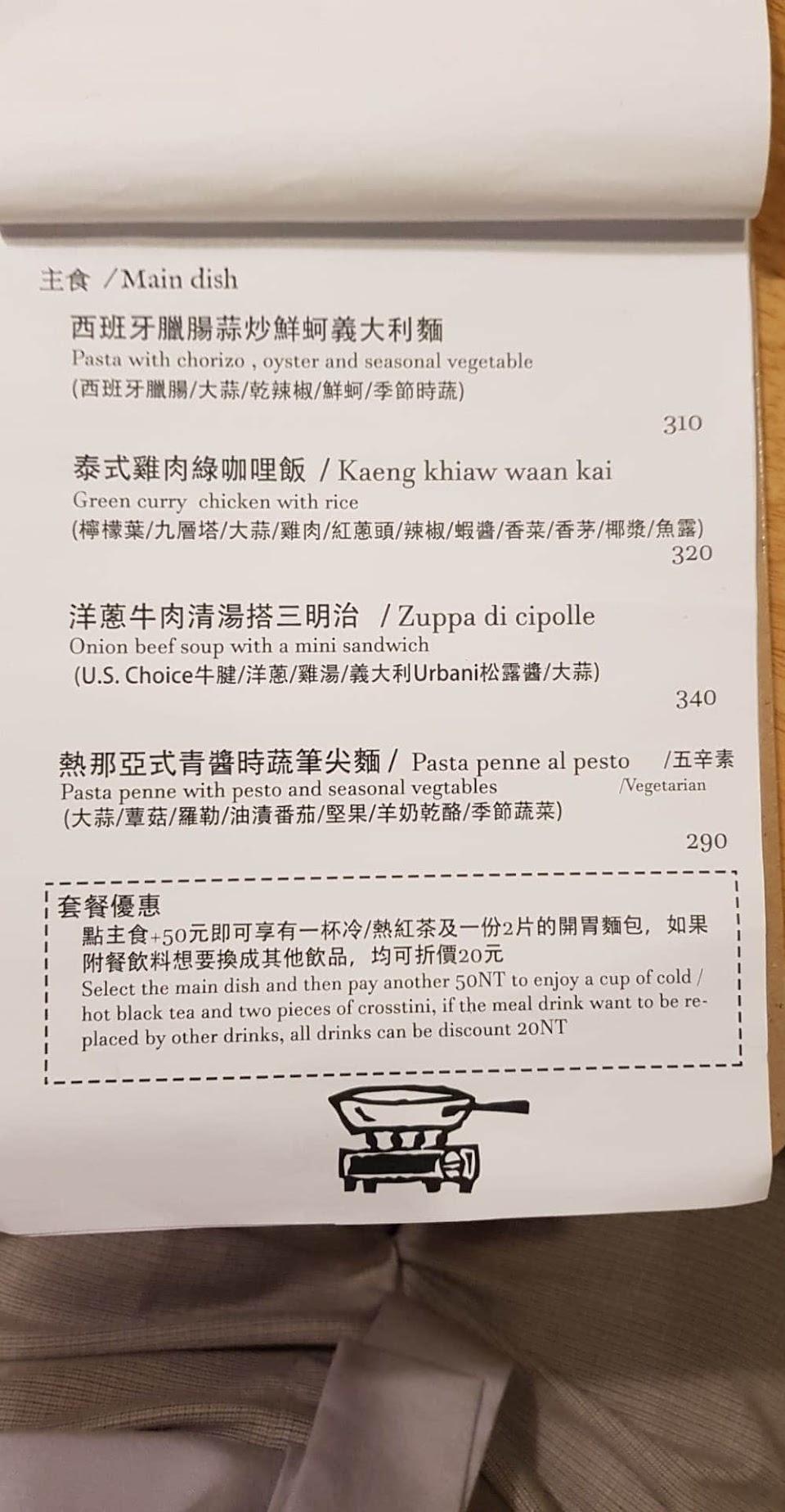 加一份套餐:一杯紅茶(冷/熱)及一份開胃麵包(兩片)+$50