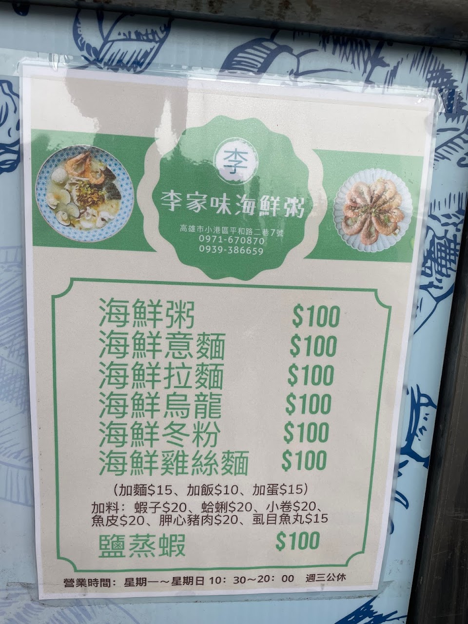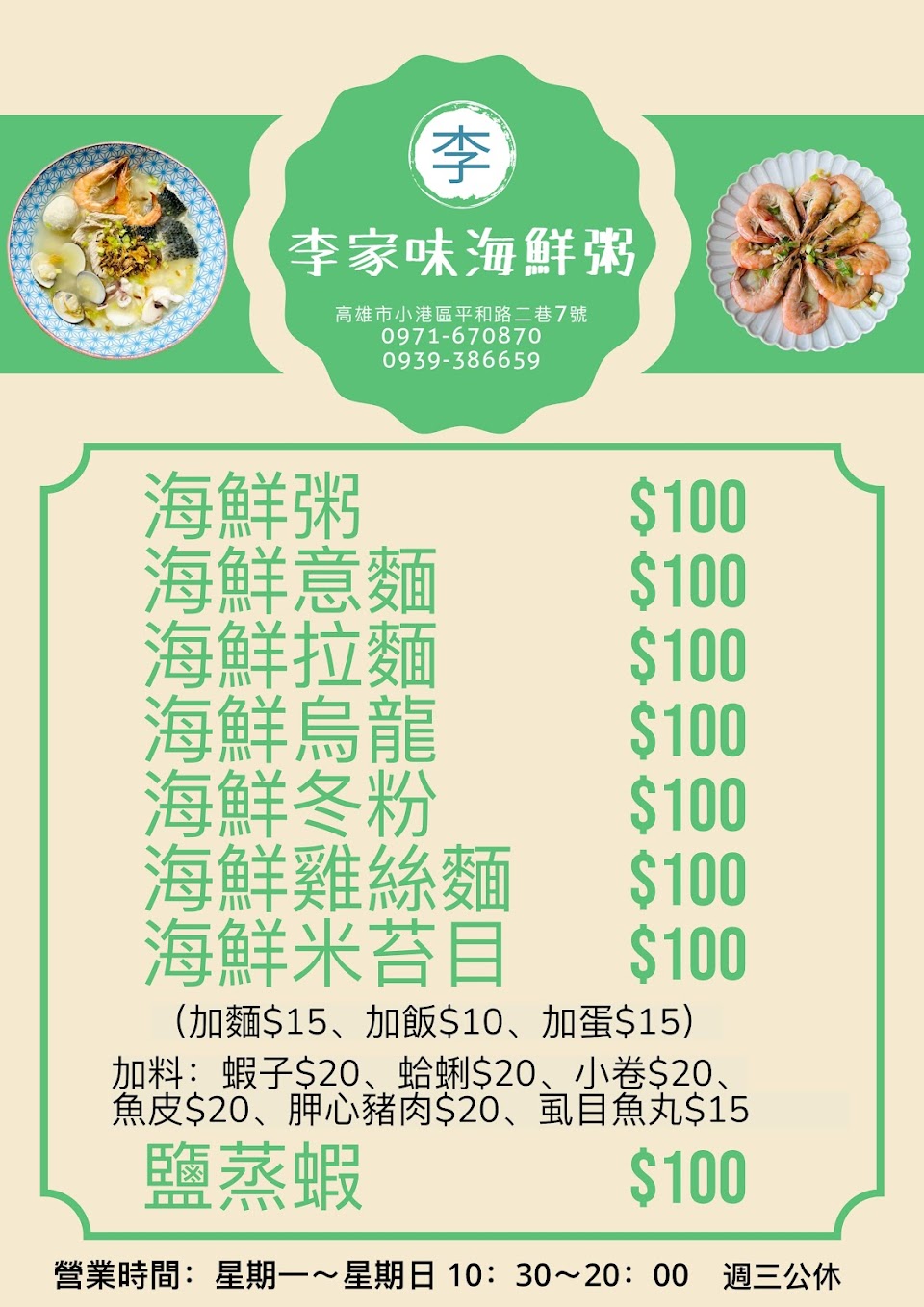 2024最新在地推薦餐廳的菜單_李家味海鮮粥 |海鮮鍋燒麵 |海鮮拉麵 |鹽蒸蝦 |海產粥|小港美食|高雄美食|外送|外帶的菜單、圖片