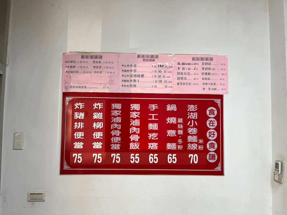 招牌燉肉骨入口即化,美味!便當配菜新鮮不膩口,可惜今日飯粒偏硬不好吃。澎湖小卷米粉量足味鮮。店內乾淨整潔,有廁所。