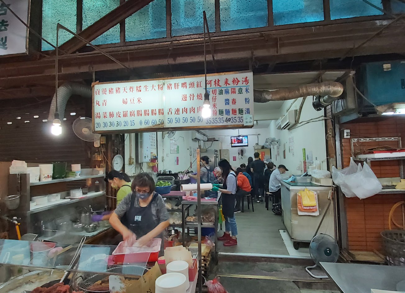 位置在市場尾端, 米粉湯好吃又便宜, 再加點黑白切、紅燒肉、炸甜不辣以及油豆腐, 這樣一餐又便宜又可以吃的很飽, 缺點是它只有白天才會開, 而且只開到中午1:30, 想吃的就要趁早來