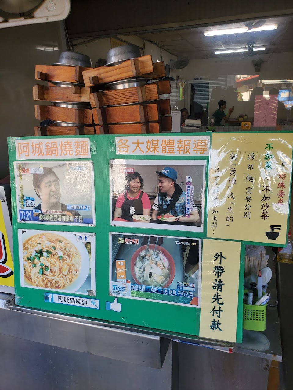 料理台掛著「阿城鍋燒麵」與電視採訪照片