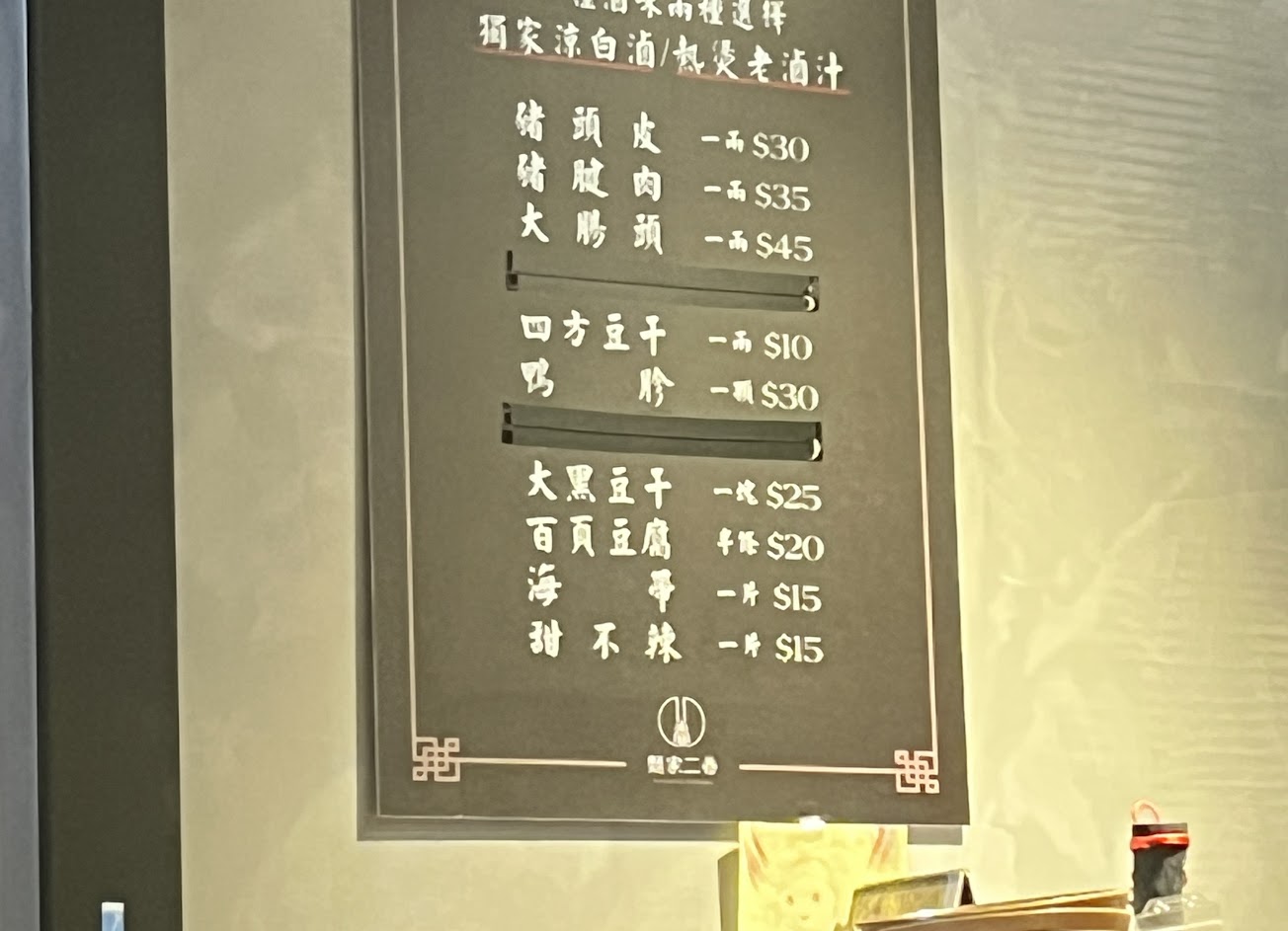 晚餐時間只剩綜合滷味可選擇,可惜沒品嚐到肉類品項,傍晚五點半用餐時肉類品項皆已售完,要享用可能中午時段才能吃到,綜合滷味內有黑豆干、百頁豆腐、海帶、甜不辣等四項,量偏少價格每份$59,刀工細緻、只是口味較一般