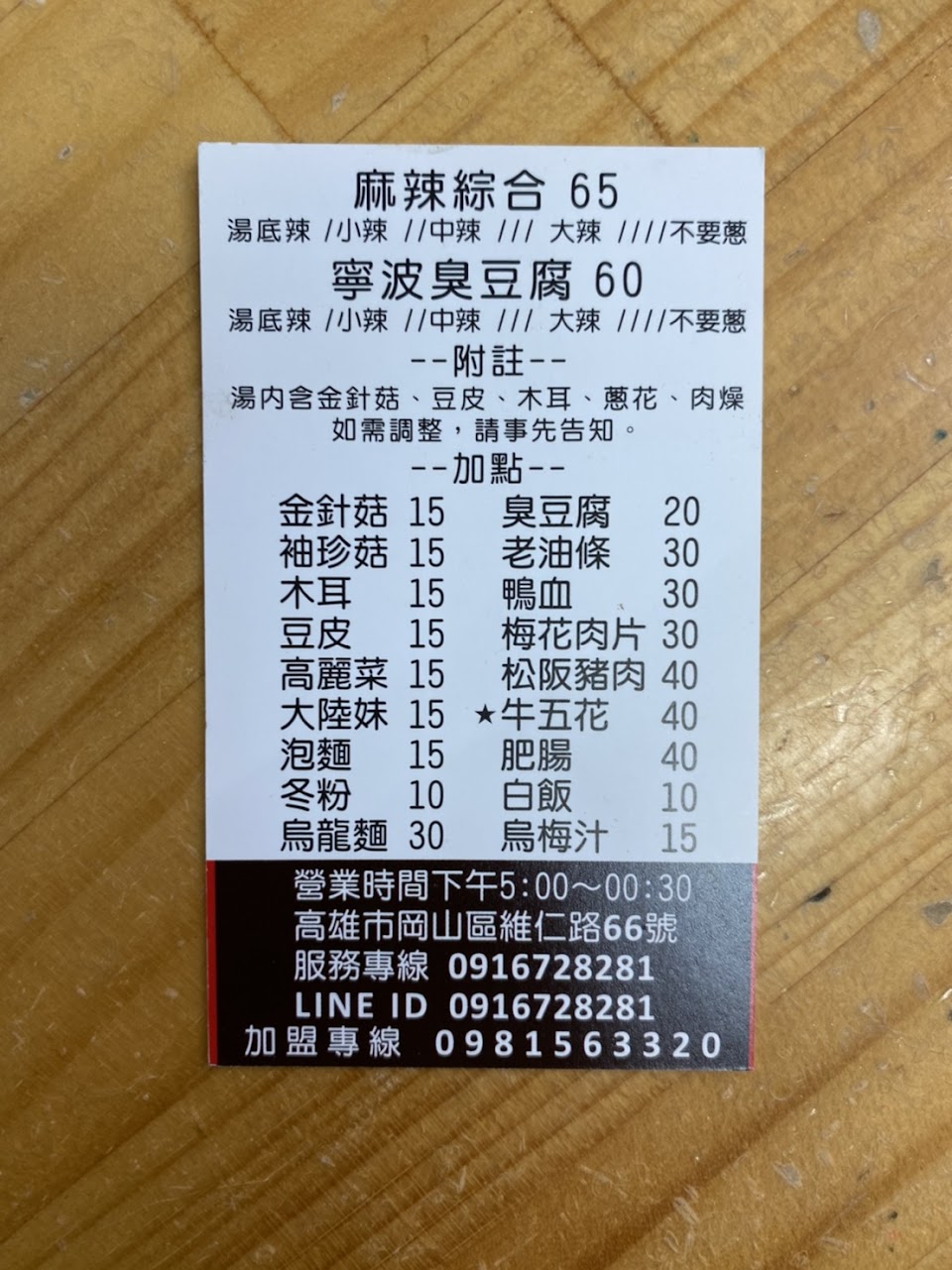 麻辣湯底不錯,鴨血好吃有入味,大腸腸內油多,牛肚有嚼勁,臭豆腐色深的感覺滷較久的比較好吃,肉片有點老,高麗菜硬,其他都不錯,老闆娘親切,生意好