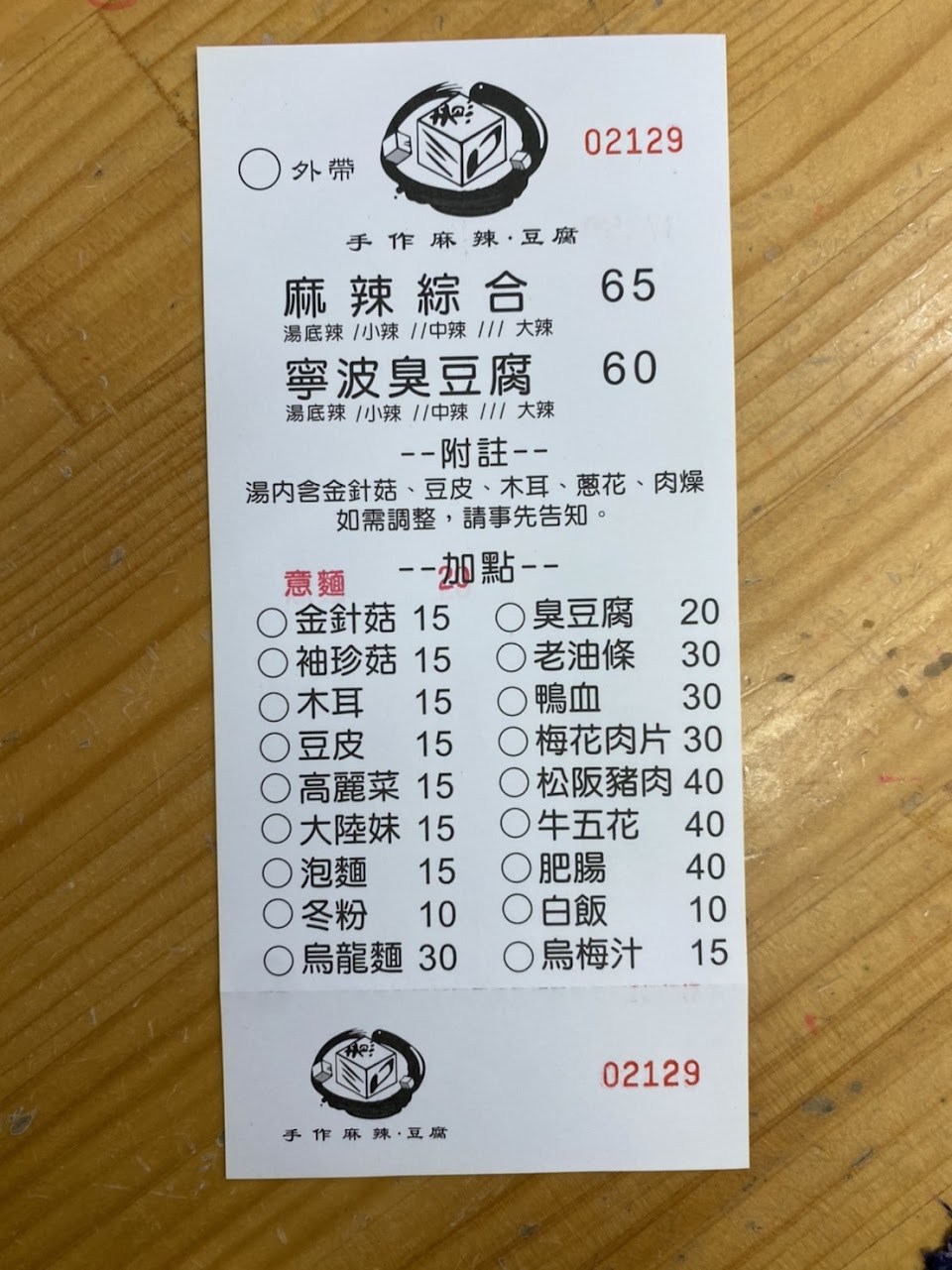65塊的麻辣綜合內含四小塊豆腐跟三大塊鴨血,還有木耳、高麗菜、金針菇及兩塊豆皮,小辣辣度對我來說剛剛好,鴨血跟豆腐本身咬起來都不辣,鴨血較嫩鹹度較豆腐高,整體吃下來飽足感蠻夠的,不過麻辣香味略為不足,口味尚可