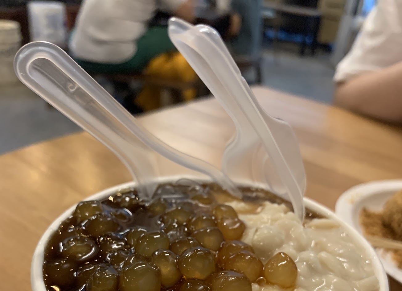 在走完樟樹步道,走進甜品店補充能量,燒麻糬有顆粒花生粉搭配,香甜好吃,再來一碗豆花才完美