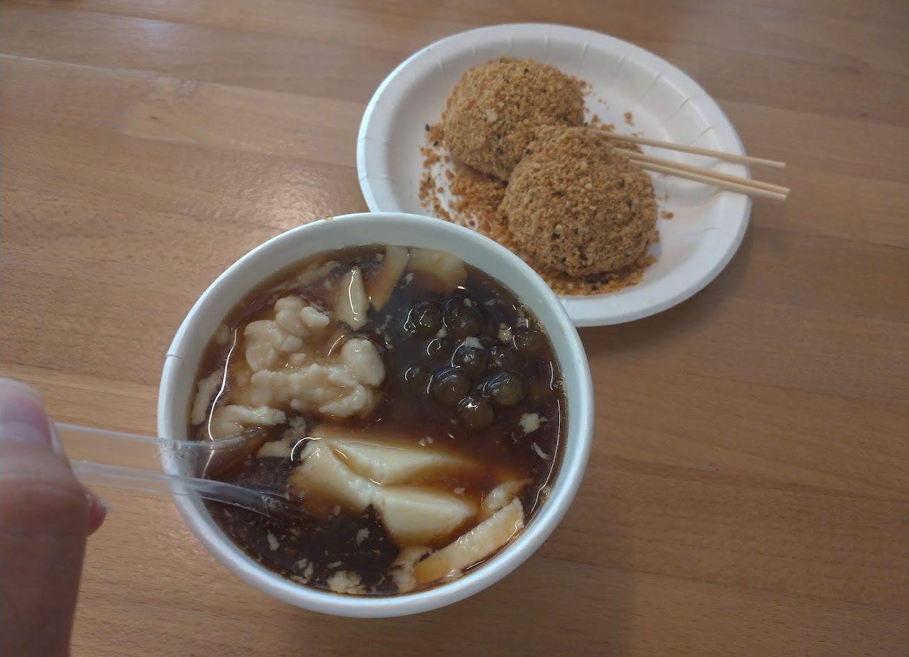 燒麻糬花生粉很香,不過大概煮太久,很糊太軟。粉圓還不錯,薑汁豆花不怎麼熱溫溫的,有點淡不夠味。