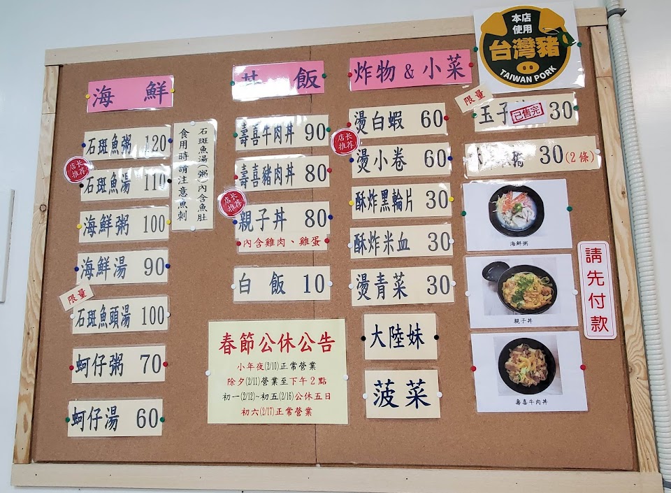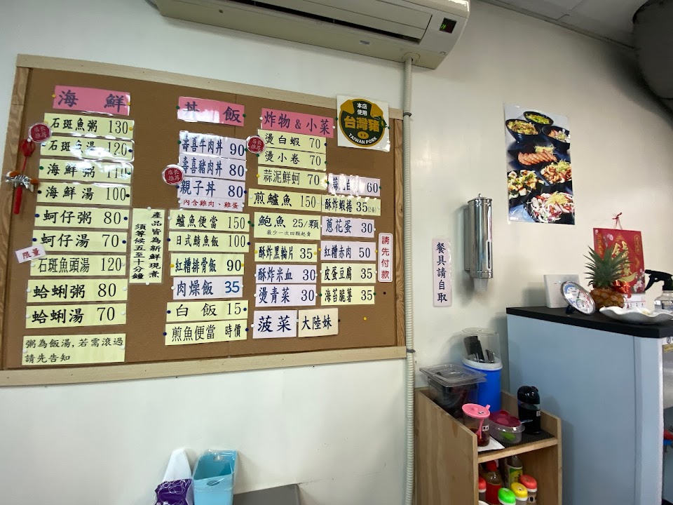 這個真是無意看到就進去吃了,看起來就乾乾淨淨的,本以為店內無客人,想說是不是不好吃,就先點餐了,吃飯中都是有客人外帶的客人很多,肉燥飯,海鮮粥,鯖魚飯,海鮮湯,肉燥吃起來不會很鹹的,湯汁在多點會更好,海鮮粥看影片就知道料多實在,鯖魚飯魚完全沒有刺,海鮮湯也料多實在,海鮮類是沒有腥味的,以上的是個人口味,是滿對位的。