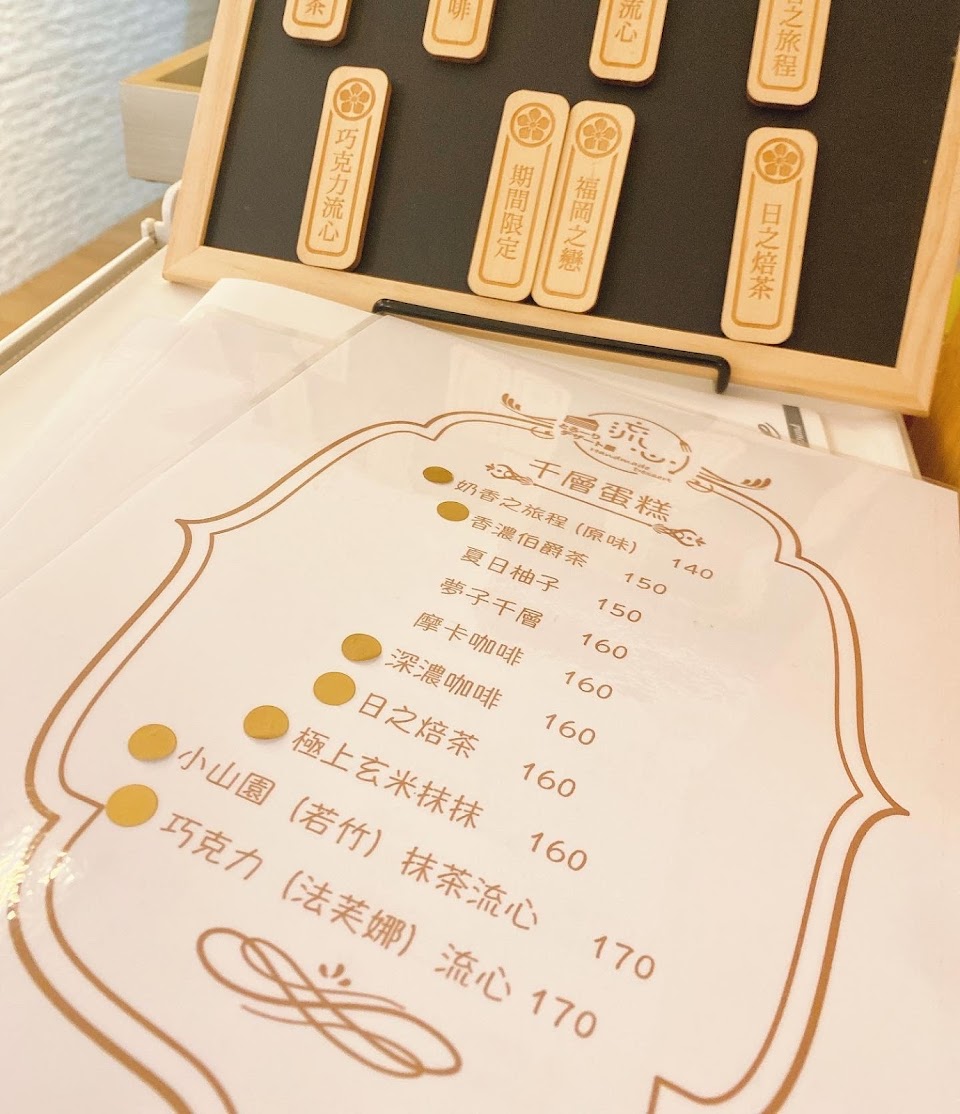 店裡除了蛋糕,當然還有茶類、咖啡等飲品,流心藏身在左營新上街巷子裡,低調不顯眼,老闆娘是香港人,人非常客氣,內用環境簡潔可愛,內用沒有低消也不收服務費,真的是超貼心的,但看到櫥窗裡千層蛋糕,很容易就多點幾塊,每一種都想嚐看看。