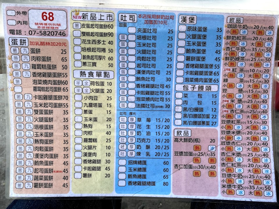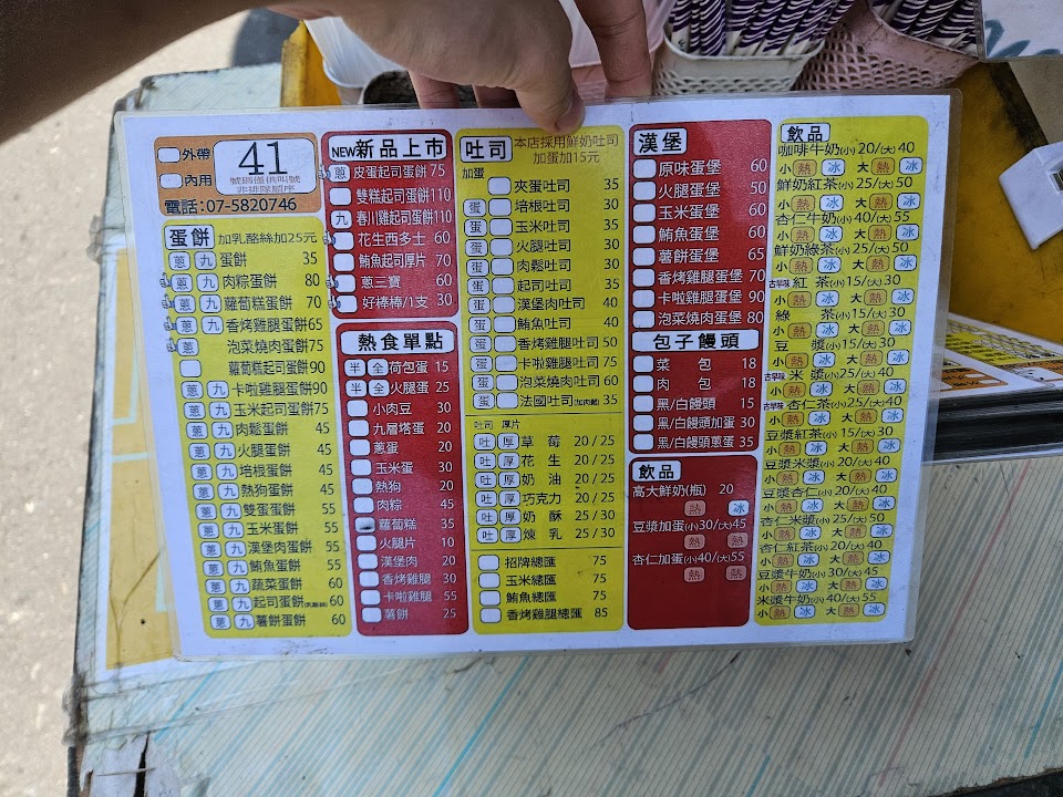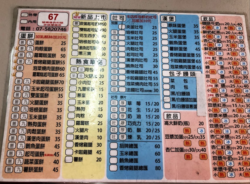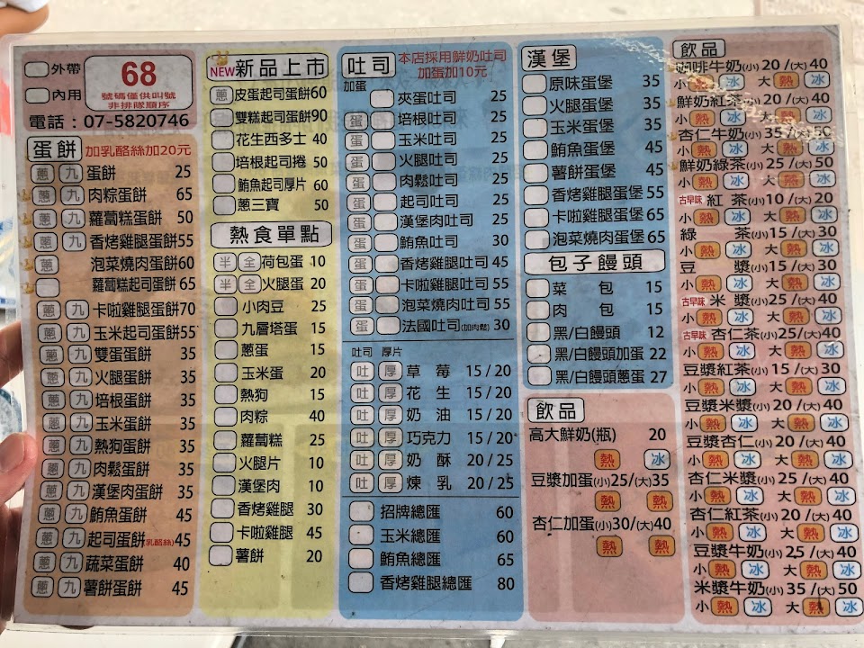 今天一共點了:皮蛋起司蛋餅70、韓式春川蛋餅100、蘿蔔糕蛋餅70、肉粽蛋餅70