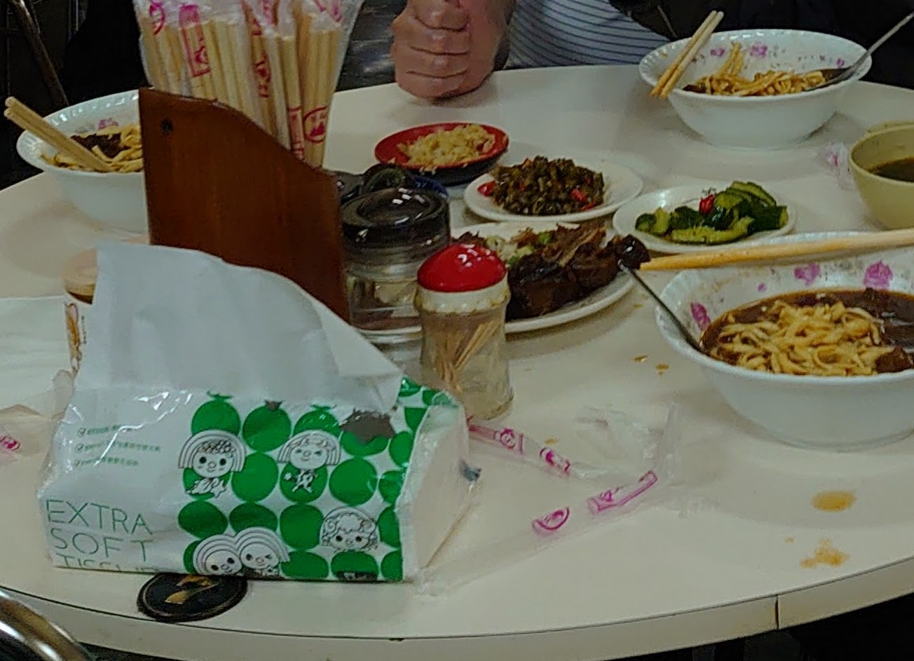 三人點了2碗大的牛肉麵和1碗大的牛肉乾拌麵,酸豆、小黄瓜丶麻辣皮蛋各一盤,滷牛肚丶牛筋丶牛肉各一份(只從櫃檯結帳人員建議,並不知量),結帳金額是1050元。扣除滷料的部份,價格算是不高(依牆上標價)。建議滷料部份,先問清楚各類乙份的價錢以及份量,免得結帳時略有意料之外的感覺。小時候吃過,印象很美味,懷念第一代老闆還在店裡走動,第二代老闆剛退伍回來接班的年代,那時麵裡的牛肉塊滷到接近黑色。二十多年沒吃,還是給個好評。