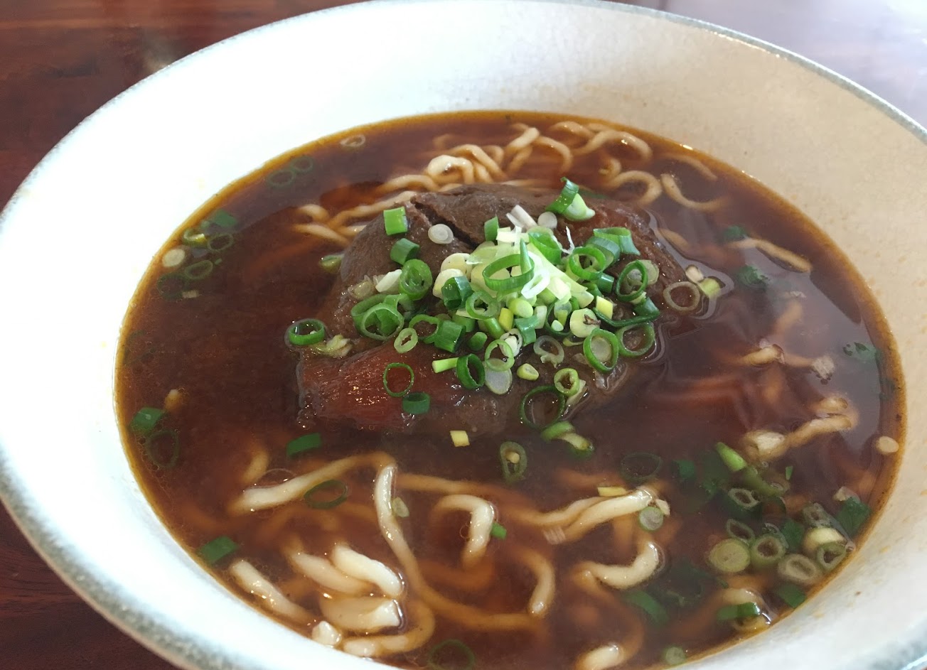 採用牛腱心,牛腱肉種類中最好吃的部位,當然也最貴,紅燒牛肉麵就是使用這個,竟然一碗才100元,要是在台北至少280起跳吧,這邊的肉質軟Q,不會因為燉很久失去口感,麵體是拉麵那種Q彈,湯頭是紅燒帶一點微辣