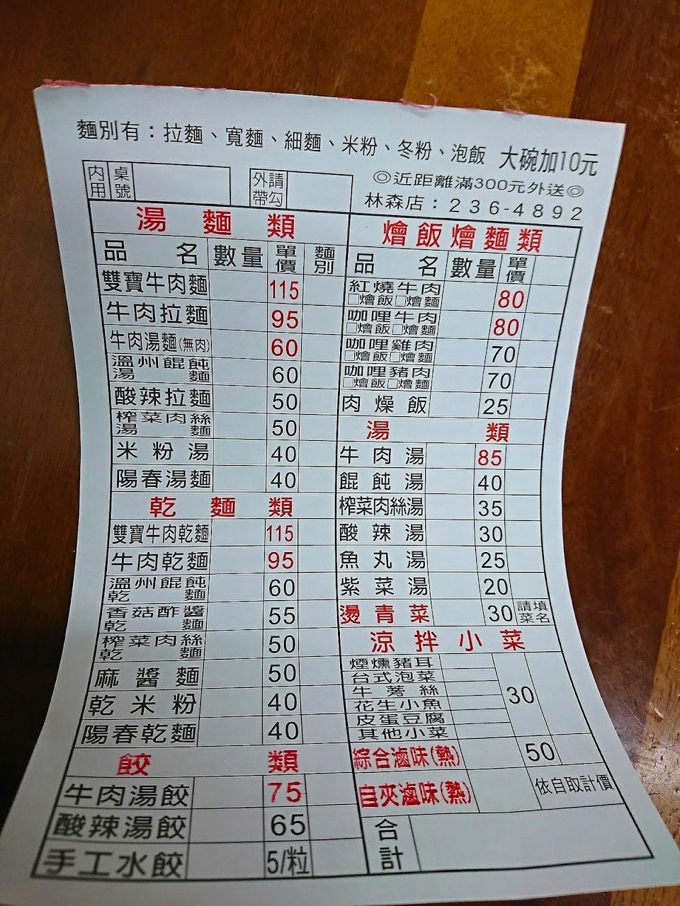 很喜歡他們的牛肉湯頭, 細麵的口感相當完美, 雙寶牛肉麵的牛肉跟牛肚品質也不差! 台式泡菜的味道跟口感符合我的口味! 唯一可惜的是餐桌整理的狀況不好, 不是客滿的時間來吃, 大部分的桌子上都還遺留餐具, 連我都吃完了, 前一個客人的碗盤都還在我的桌上!