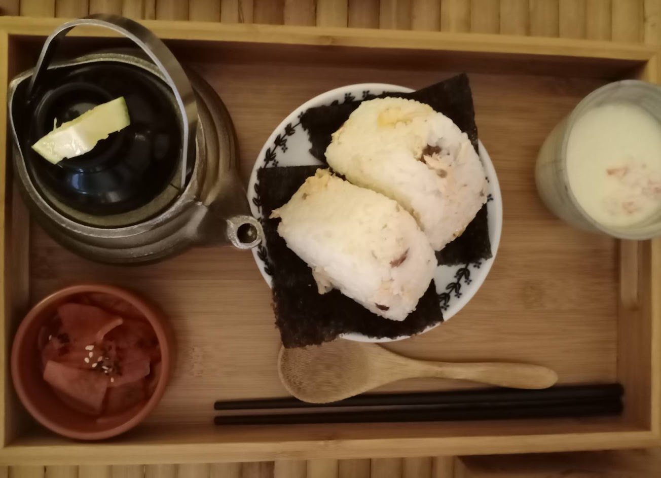 店內環境很不錯,有日式小物還會播電影(?)但沒有放出聲音 餐點的部分,飯糰就是飯糰XD,但價位非常平價。土瓶蒸好喝!
