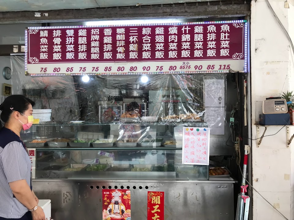 網友阿霞推薦來此用餐,點了排骨和雞排的雙拼菜飯90元。可以任選3樣菜,還有免費蛋花湯可自取。排骨和雞排的油炸火候控制的很好。中午時段外帶的客人不少