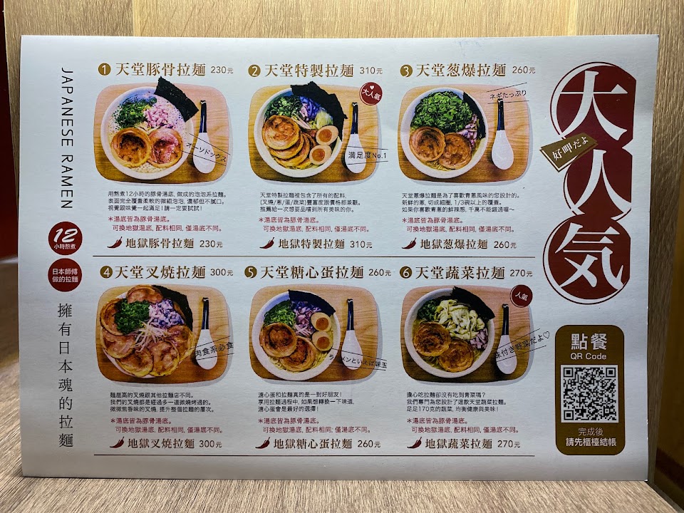 麵有兩種湯底可以選(天堂跟地獄),地獄就是辣的意思。麵體也可以選細、粗,湯能選一般或濃郁,剩下會依照選擇口味有不同配料。 當天點天堂蔥爆跟天堂溏心蛋,皆$250。基本上就是配料的差異,個人覺得湯底適中,不會濃郁到膩,但是仍很有味道,叉燒肉很好吃,麵的菜是豆芽菜,增添清爽感。整體來說雖然價格中高,但是好吃的拉麵,推薦給有來美麗島的朋朋。