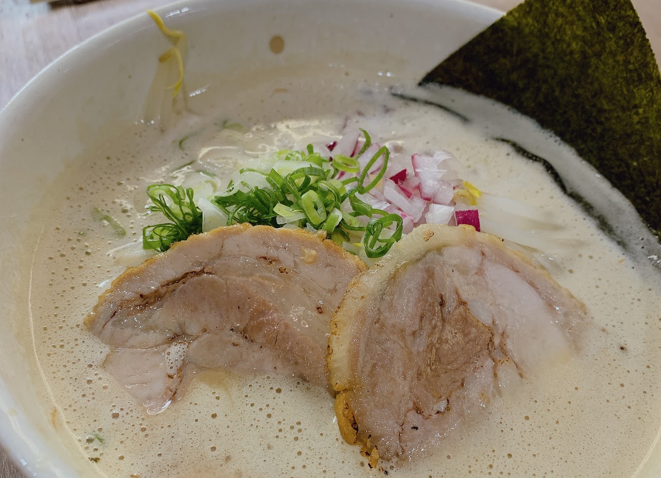 湯頭是溫和的湯頭,有青蔥跟洋蔥當配料提味,但整體並沒有特別的記憶點。 叉燒的薄度跟處理方式,吃起來會稍微柴了一點。 麵條煮的恰到好處。 雖然說是日本店員,但態度並沒有比台灣店員好。 現在給人的感覺跟六合路剛開業給客人的感覺,變了很多。
