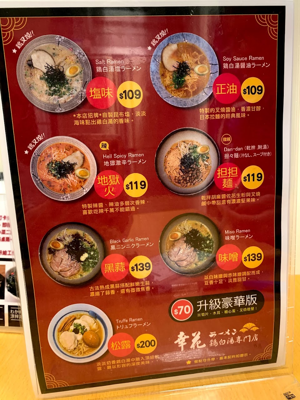 價格在99-109間,雖然配菜上少一些,但可以加錢選擇喜歡的配菜,個人蠻喜歡的。 主體的湯頭十分濃醇,伴隨著雞油香氣(會有一點點點的雞油騷味),搭配有嚼勁的麵條,十分令人滿意。 鹽味是可以充分品嚐到湯頭的原味,地獄火則適合喜歡重度辣味的愛好者。