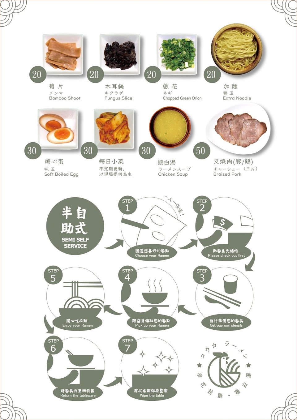 服務態度有夠差 用餐當天選了鹽味拉麵 只是跟老闆說不要放筍乾跟木耳 老闆就回這個沒有喔 只是再詢問一次那請問有什麼 老闆就非常不客氣說「阿你沒有看照片?」? 然後拉麵109元 我只是先拿100元出來(零錢在拿) 老闆就態度很差說109元(好像怕我只給他100) (有時客人沒清楚看照片,可以好好跟客人講不需要這麼不耐煩^_^) 湯頭好喝 麵的口感真的有點像陽春麵 叉燒肉當天吃裡面還有一點點冷冷的