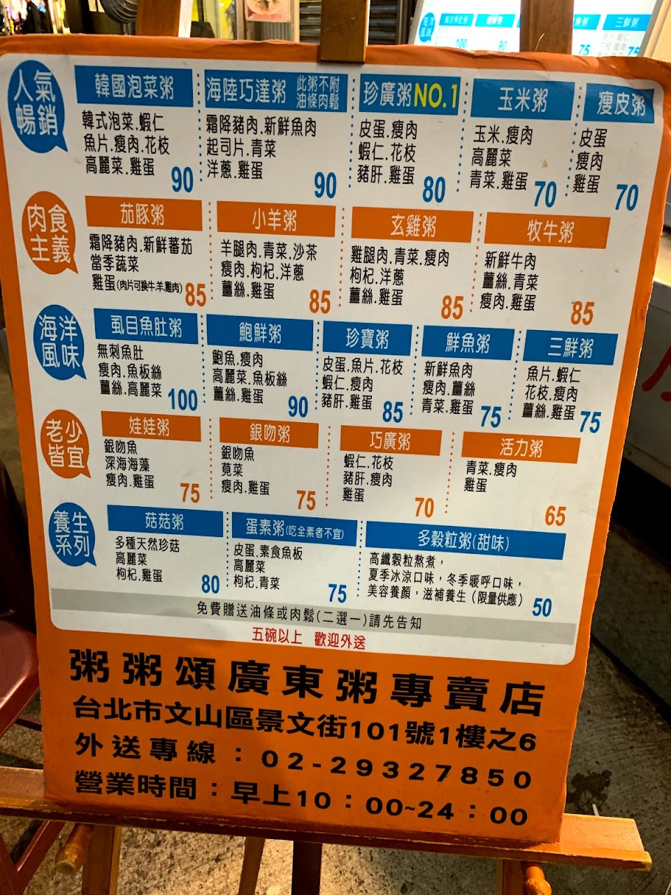 粥都很好吃料也很足,店家生意很好建議先打電話叫,通常要等15~40分鐘都有,位於景美夜市比較外面的巷道,每次去都看到滿滿的人在等