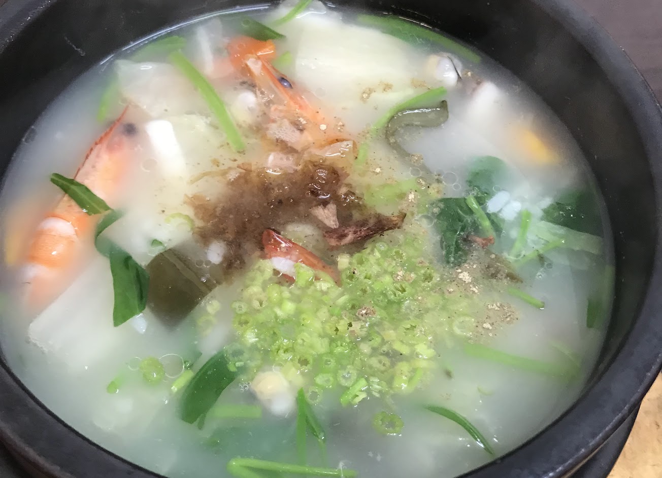 海鮮粥:兩隻蝦子、菜頭、地瓜葉、台灣鯛、蛤蜊、其他海鮮。 種類豐富外帶也蠻快的。