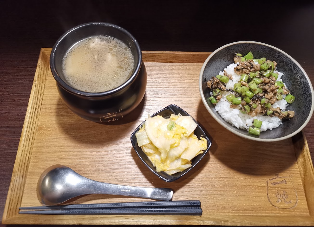 份量剛好 燉雞湯濃郁好喝 雞肉很嫩 肉燥飯是瘦肉的 加上四季豆跟梅干菜很好吃 店內氣氛很棒