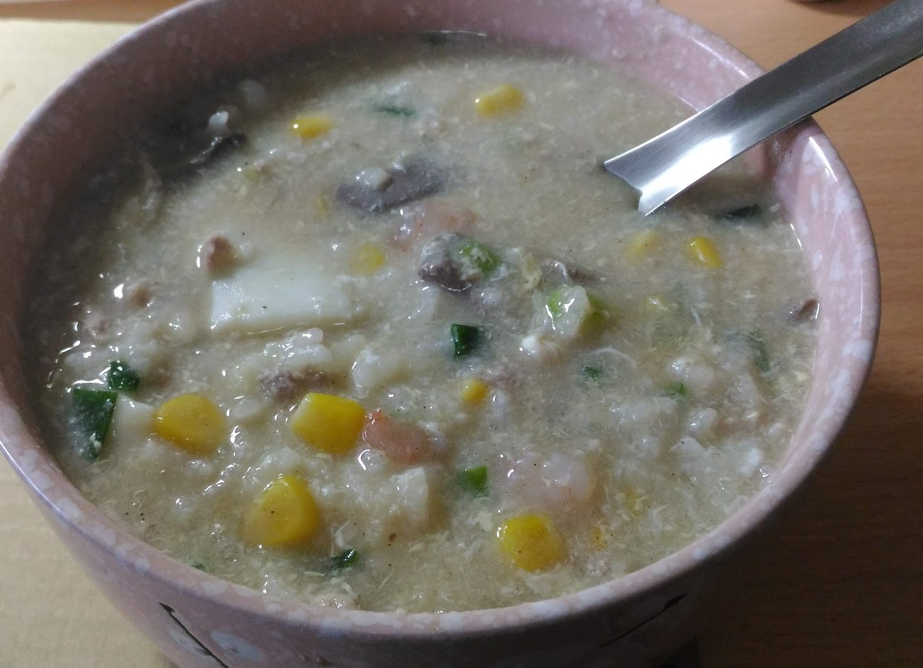 確診在家 吃他的豬肝粥 材料豐富美味 高麗菜和玉米都非常清甜,胡椒了一點 嚴格來說還是台味粥