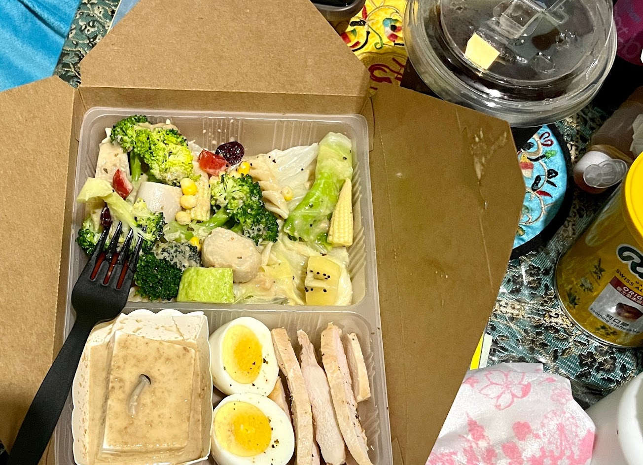 外送餐點,很好吃很清爽,蔬菜份量很多,有高麗菜,杏包菇,花椰菜等,豆腐跟蛋也都很好吃,搭配醬汁味道很夠,但是肉有點偏少,而且價格有點高