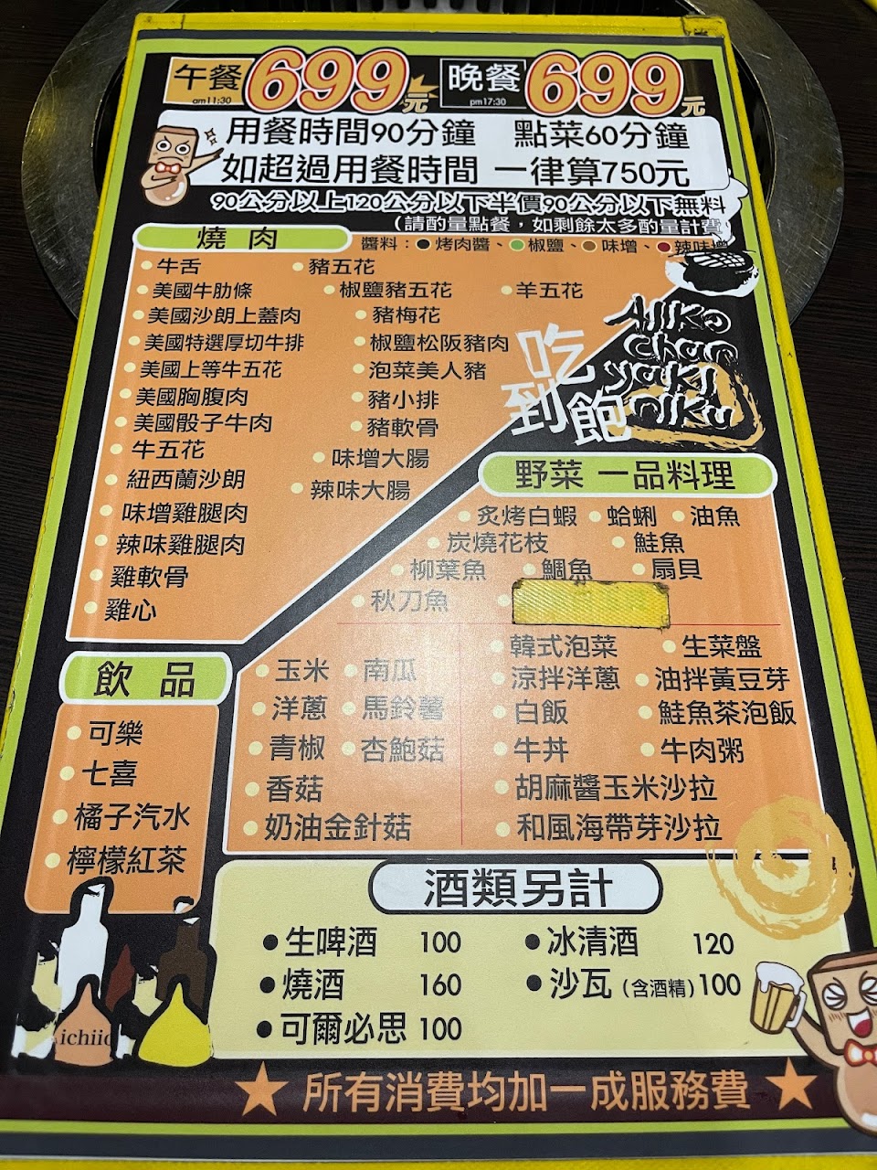 以加一成服務費吃到飽750元來說cp值不錯,光木碳烤肉就先贏了一半,上菜很快,換網子殷勤,服務超棒,肉質符合期待,度過一個美麗的夜晚!!