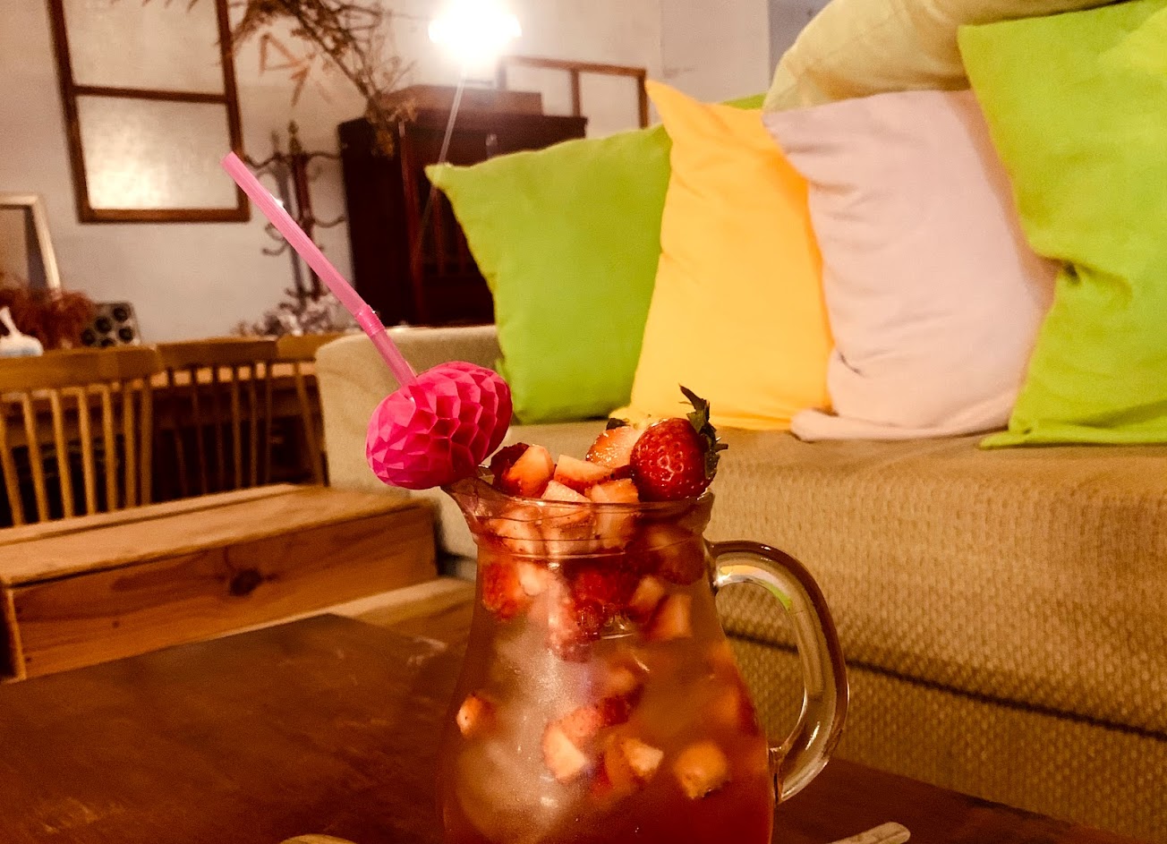 一壺大杯的草莓氣泡飲,裡面切滿草莓碎片,喝起來超好喝,外觀佈置的很夢幻。