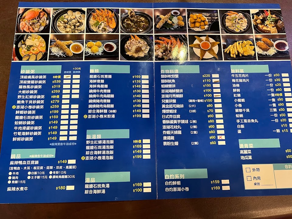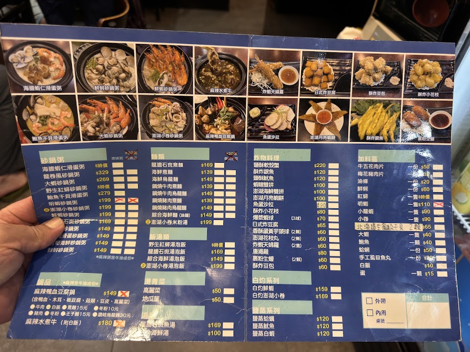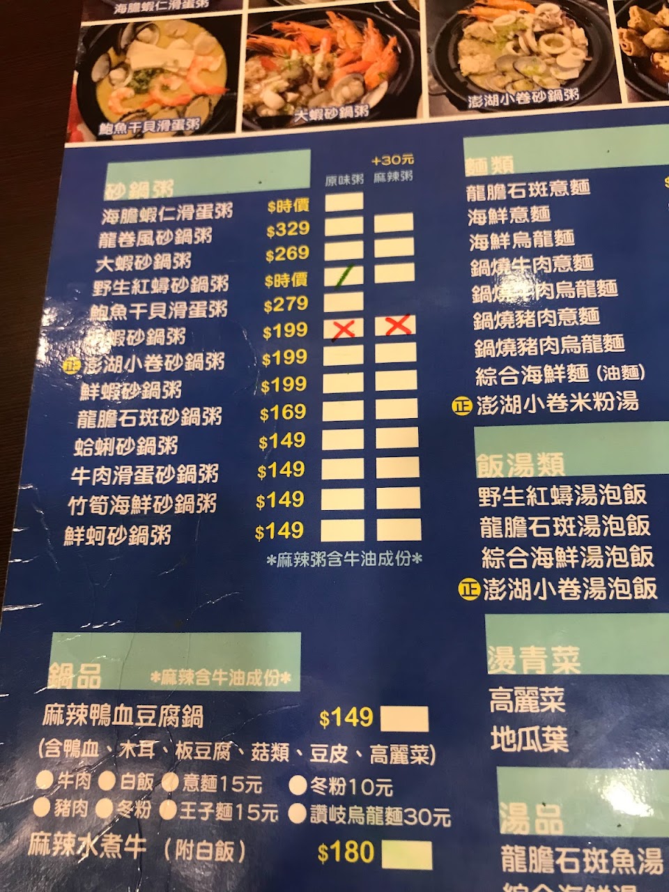 就是個海鮮粥,炸物比粥好吃、麻辣鴨血不會辣,大概這樣吧…不過海鮮很新鮮給個讚