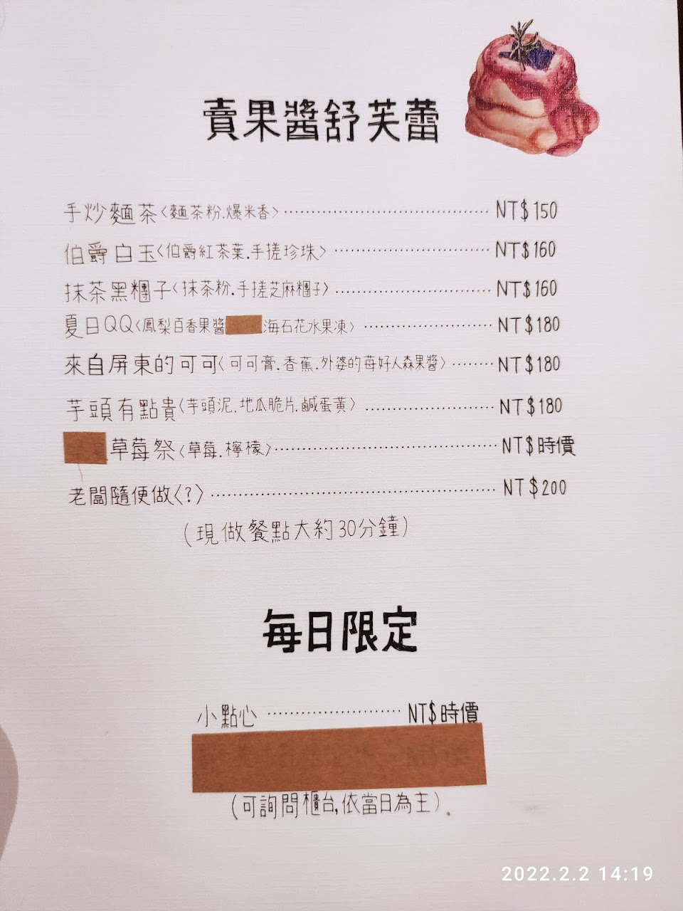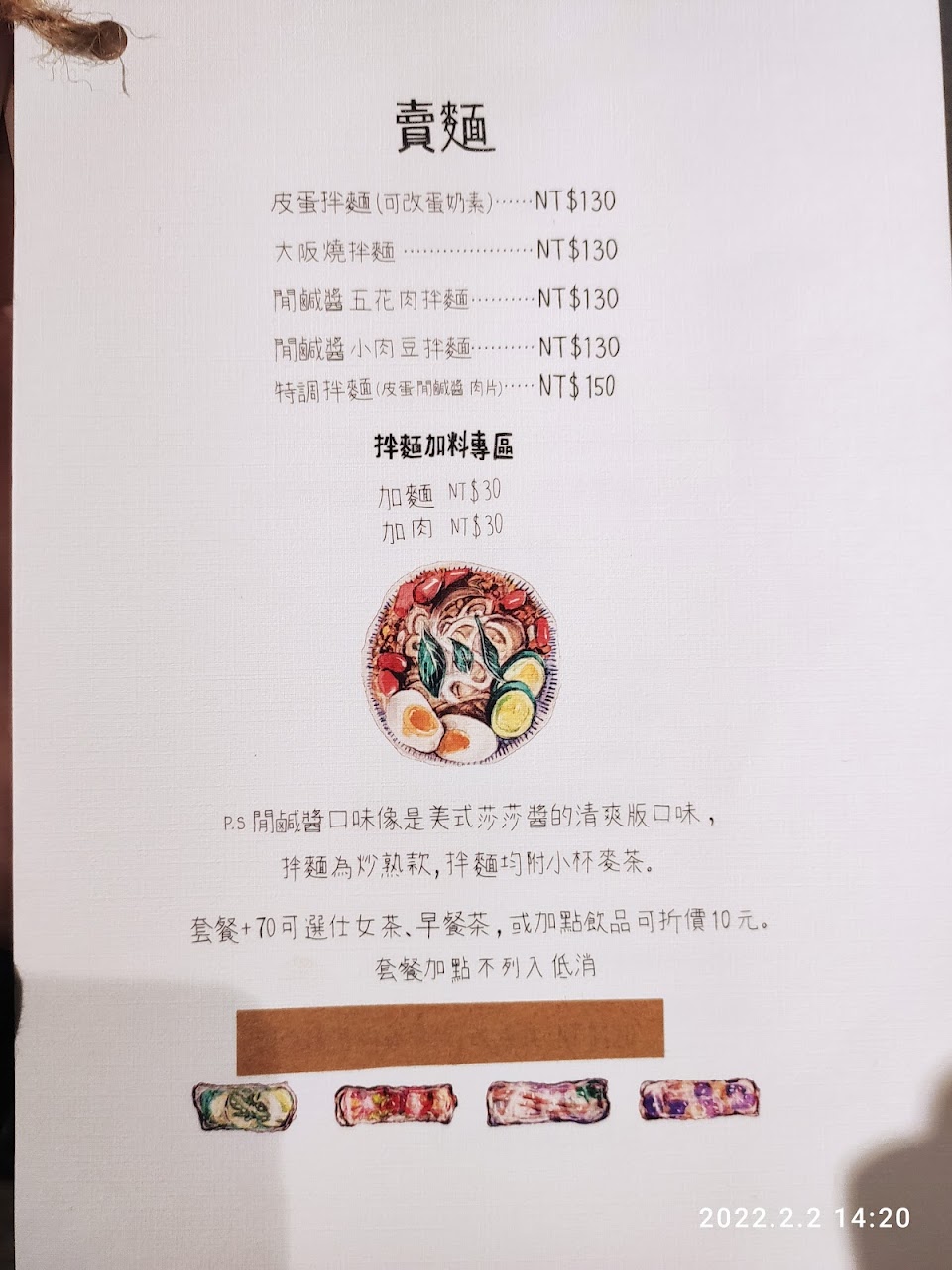 位置就在逍遙園後門對面,附近鄰近錦田停車場,店面空間小小的,保有老屋的磚瓦,初次用餐坐一樓,有機會可以上二樓座位,看出去逍遙園的景色應該很讚!店內採自助式,會利用廣播通知取餐,很可惜當天沒有點到伯爵白玉舒芙蕾,點了麵茶跟老闆隨便做,麵茶是比較固態狀的,不是流動的淋醬,口味上剛好不過甜,搭配爆米香在口感上能有更多層次,但這口味吃到最後會有點膩,老闆隨便做當天的口味是巨峰葡萄,但說真的吃不太出來葡萄的香氣跟味道,反倒是吃到奶味多過於葡萄味,上面灑的應該是香吉士(?)多汁的口感也為這個口味帶來新的感受,鹹食部分點了皮蛋拌麵,麵體是手工拉麵,口感Q彈有勁,搭配皮蛋醬跟紅蘿蔔、小黃瓜絲,就是一種涼麵的概念,份量不多,吃個氣味沒問題,店內環境適合約會,吃飽還能去對面逍遙園走走,行程直接幫你規劃好了~?