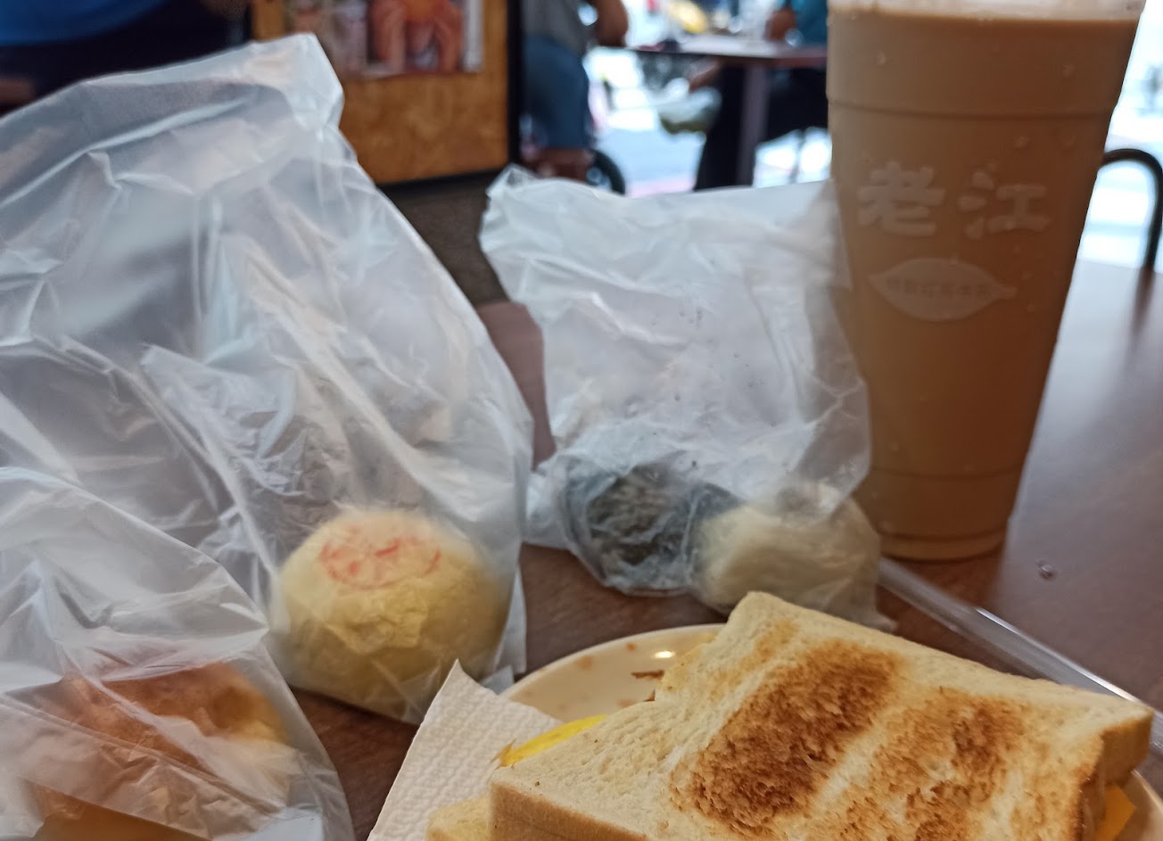 「老江紅茶牛奶」除了紅茶牛奶,還有烤吐司、肉包、蛋餅、蛋糕等各式早點,雖店面小也無特殊裝潢,客人卻絡繹不絕。