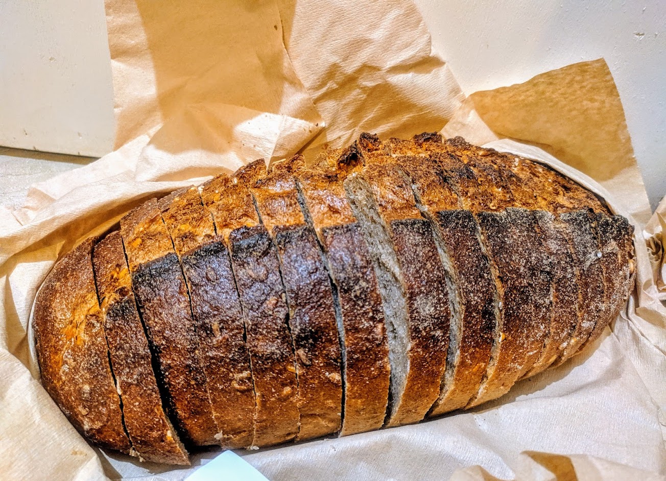 老闆會現切片 店內也講求環保 用紙袋包著現做的麵包 如果需要提袋可以租借 老闆也會親切的跟你解釋麵包的風味以及保存加熱的建議