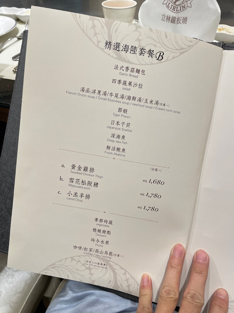 $1500的價位,覺得普普,雖有一顆中等size的干貝,有顆小鮑魚,沒有沙拉吧,甜點也普普,在其他家或飯店內,都會有自助沙拉吧,飯後還會更換場地享用精美好吃特殊的甜品咖啡茶飲水果,立林我們這次好像都沒有!