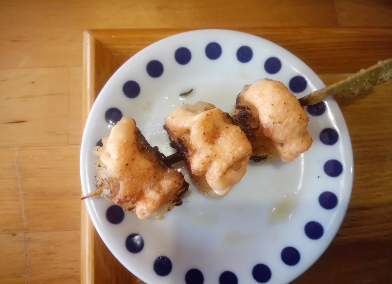 三樣小菜分別是:明太子醬杏鮑菇,口味還可以但有點冷了;黃芥末醬過貓,這個最奇怪,醬很酸很重口,跟適合清爽實用的過貓超不和諧;好像是黃芥末醬南瓜,也很重口、沒記憶點。三個小菜味道都很重,完全沒起到日式小菜該有的「品嚐主菜之餘轉換口味之用」這樣的功效,只讓我想多喝幾口茶。