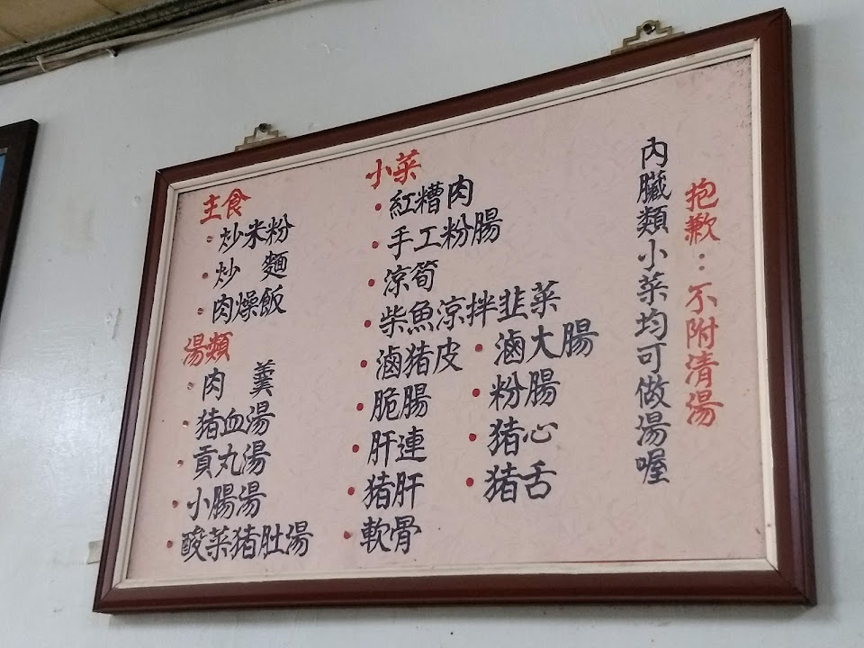 主食 炒米粉 炒麵 肉燥飯,其他是點菜類跟湯,當然同台南相似 小菜的豬內臟類也可以做成湯類。 紅糟肉裹粉是甜的,跟粉腸一樣全用瘦肉。 炒米粉很Q。雖有菜單 沒標價 ! 售價還可以咧!