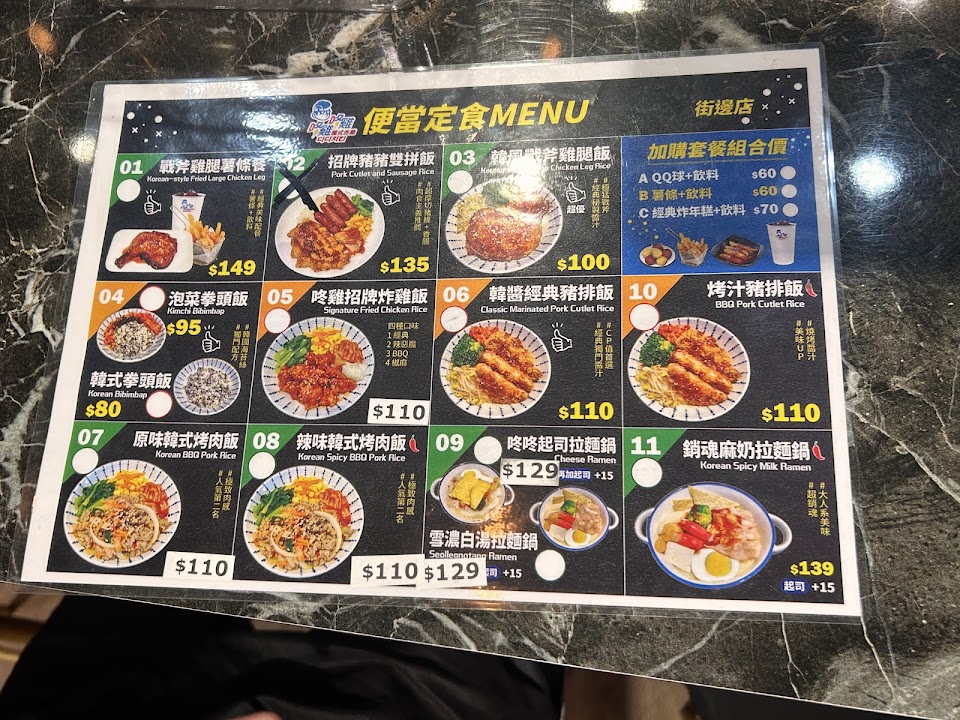 烤肉飯份量很夠,泡菜好吃,配菜豆芽菜偏鹹。辛拉麵料意外的多,有少量青菜、蛋、泡菜、年糕、豆皮、四五塊豬肉,還有要加價的起士,吃完很有飽足感!炸雞賣相普普,不是日式炸物的那種金黃,比較像拔絲地瓜的顏色,味道尚可,沒有讓人驚艷的地方,比較可惜!整體來說,正餐比炸雞好吃XD 服務態度好,用餐環境乾淨整潔~