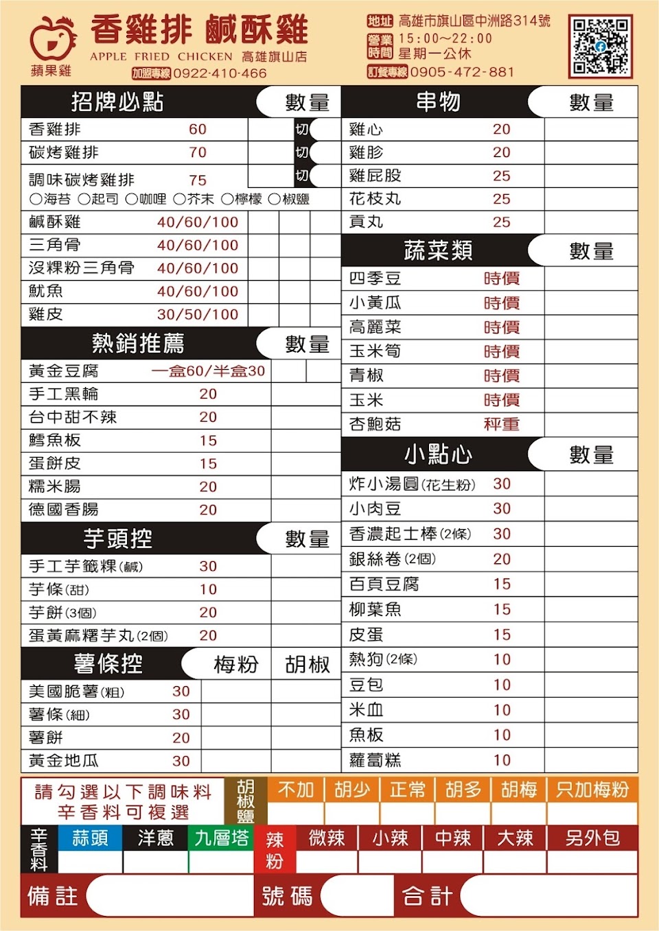 2024最新在地推薦餐廳的菜單_蘋果雞鹹酥雞 高雄旗山店(雞排/炸物)旗山宵夜/溪洲夜市/旗山區美食/旗山美食/旗山小吃/鹽酥雞的菜單、圖片