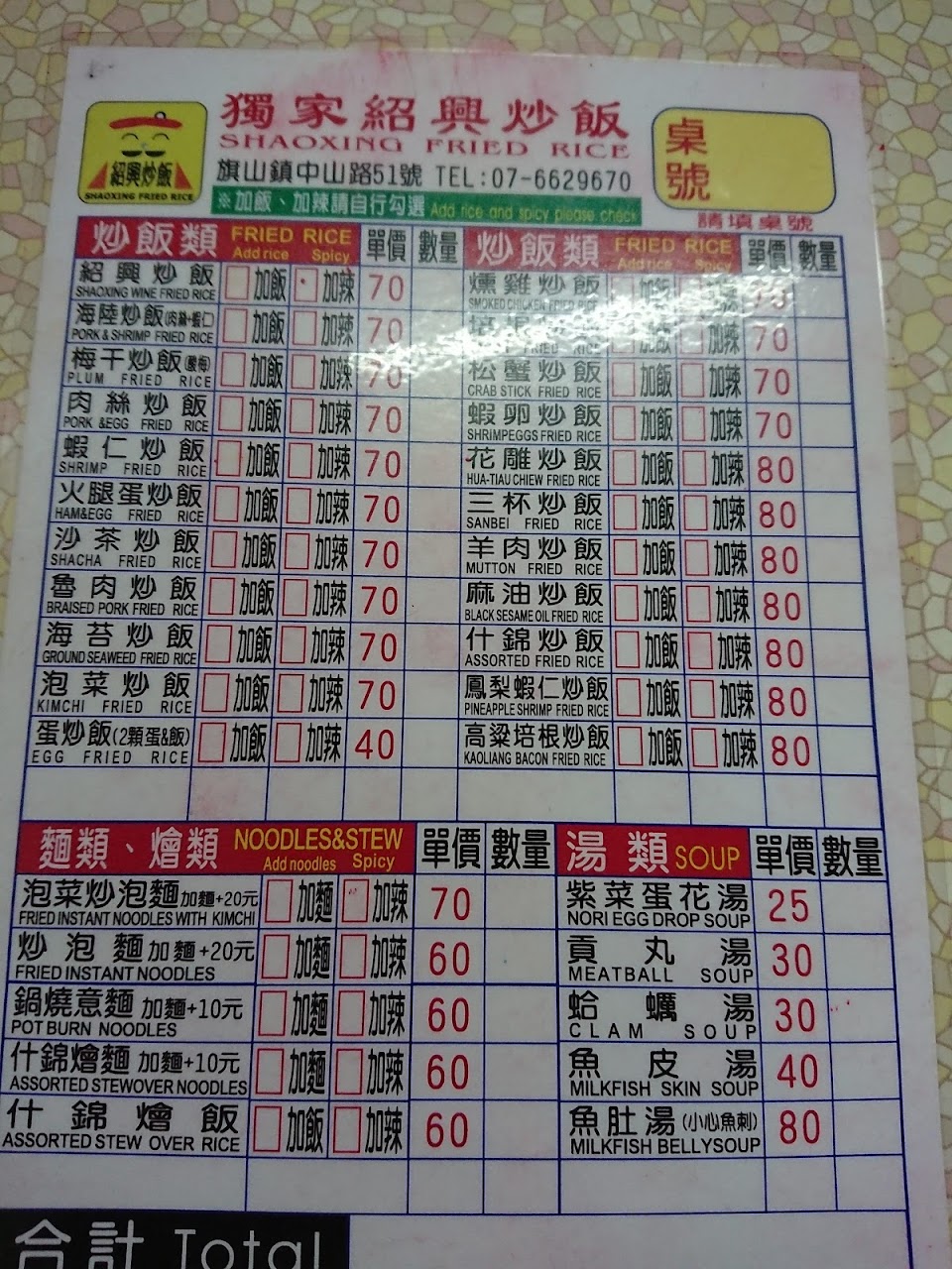 端午節去旗山老街, 點了培根炒飯和海鮮炒飯, 真的是非常好吃的炒飯, 粒粒分明, 培根有淡淡的絕興酒味, 不是市售培根, 是店家自製…….加飯不用錢, 超讚