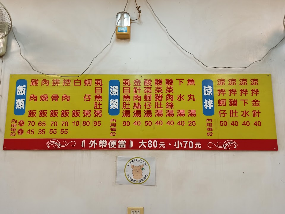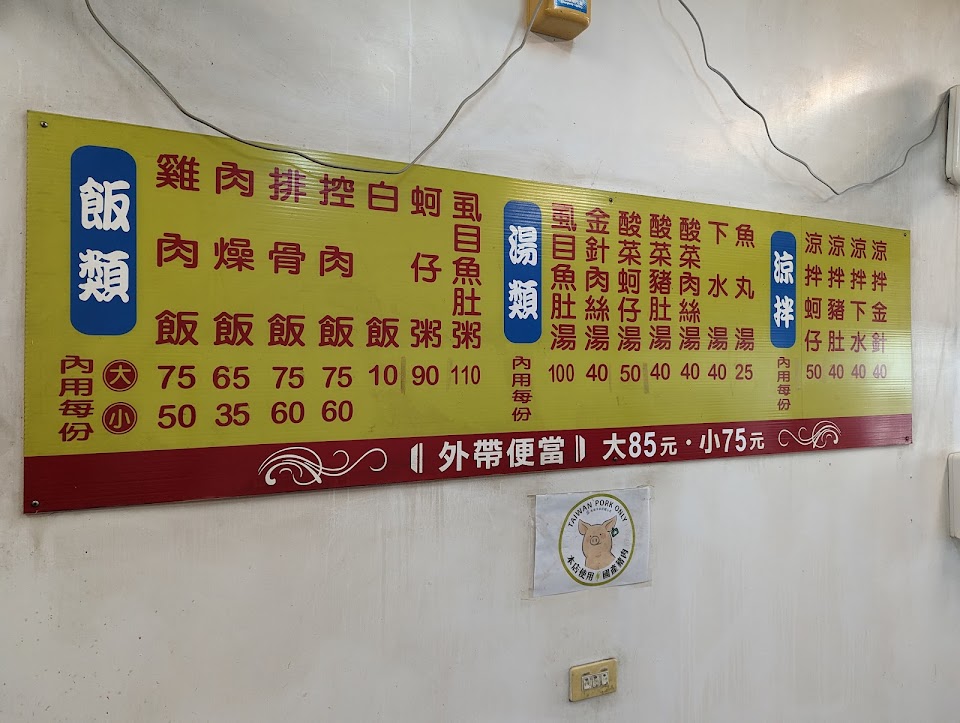 旗山地區CP值算高的店,外帶排骨飯(大)75元,可以吃飽飽的,但就是固定菜色高麗菜+筍乾。個人建議吃法,排骨不要泡滷汁,肉躁澆飯上!下水湯也是不錯,下水不會硬到咬不動!飯點時間人很多,建議電話預訂!
