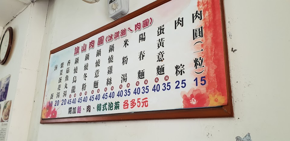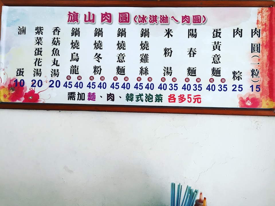 旗山在地的好味道,老闆們非常親切,價格也很親民,重點是味道很棒,肉圓15一顆非常不馬虎,有蒜泥非常特別,肉粽25也非常超值,鍋燒意麵40有蛋有菜有兩顆丸子,推薦!