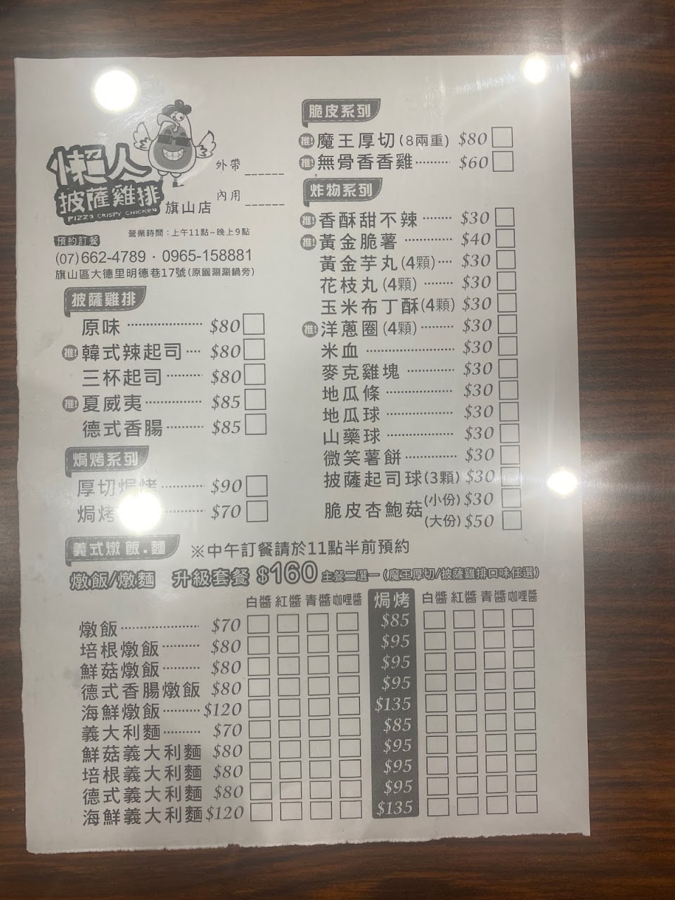 白醬培根燉飯80元 韓式辣起司雞排(出錯80元 厚切雞排80元 無骨香香雞60元 3.5?