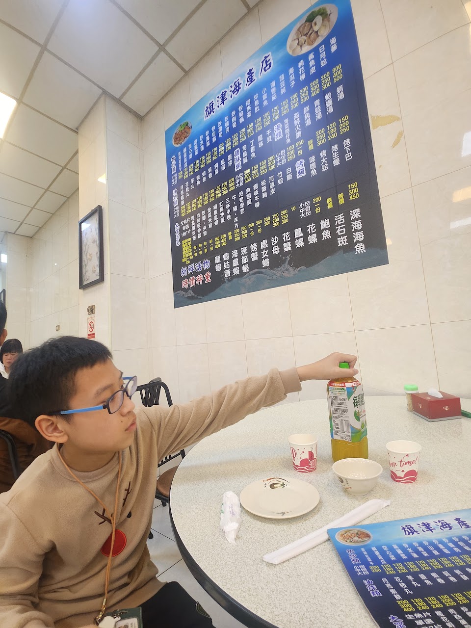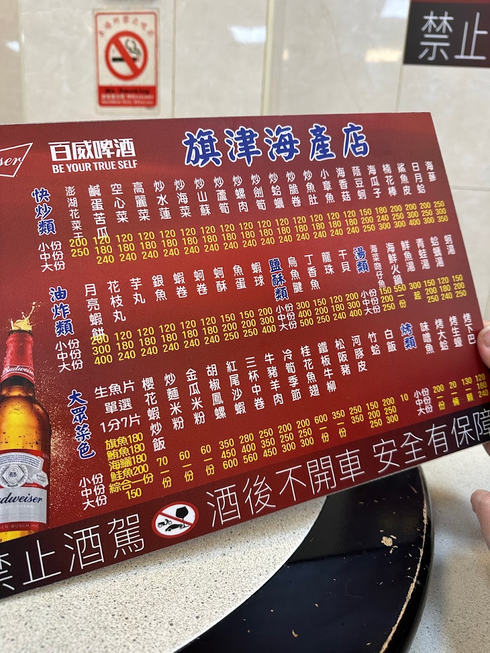 剛進店時,招待員要我們坐10人桌,但因為我們只有4人,就往小桌方向去,但是招待員還是要我們座10人桌,因為小桌那區剛好在清洗地板(因為我們未17:00就進店用膳),在店門口小桌上就整齊排放菜單,價格極度透明,而且新鮮度破表,下次有機會會再光臨。