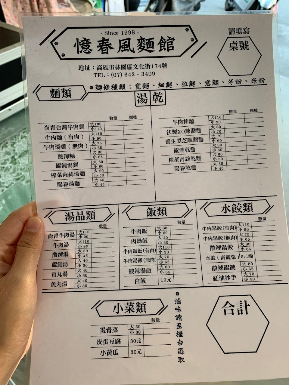 以南部來說算是價位偏高的麵店,但是份量非常足夠,點小份的麵類當主食,搭配滷菜以及酸辣湯已經足夠填飽肚子。滷菜種類非常多元,且都入味,如果要來品嚐的話,小菜算是不可錯過的一大重點,可以讓你的餐點搭配有大大的風味提升。 麵類有拉麵、細麵以及粗麵等等的不同選擇,讓每個人可以根據喜好來挑選自己喜歡的口感以及口味。最主打的還是牛肉麵系列,但本人是喜歡他的酸辣湯以及乾麵系列,酸辣湯的料非常充足以及多元,一碗30以及40的價格可以說是非常值回票價,而他的水餃也是許多人會選擇的一個餐點,非常飽滿且夠味。 如果你有空來到林園旅遊不知道要吃什麼的時候,這間億春風麵館或許會是你一個可以考慮的選擇。