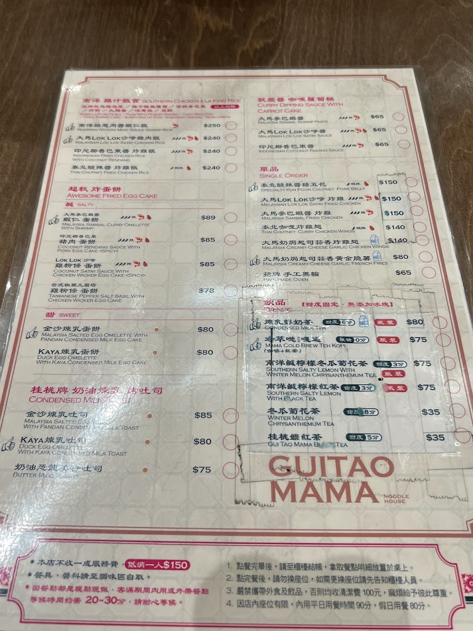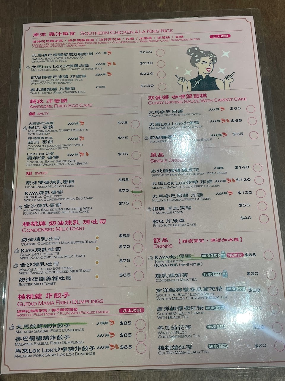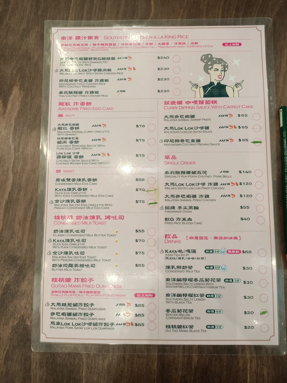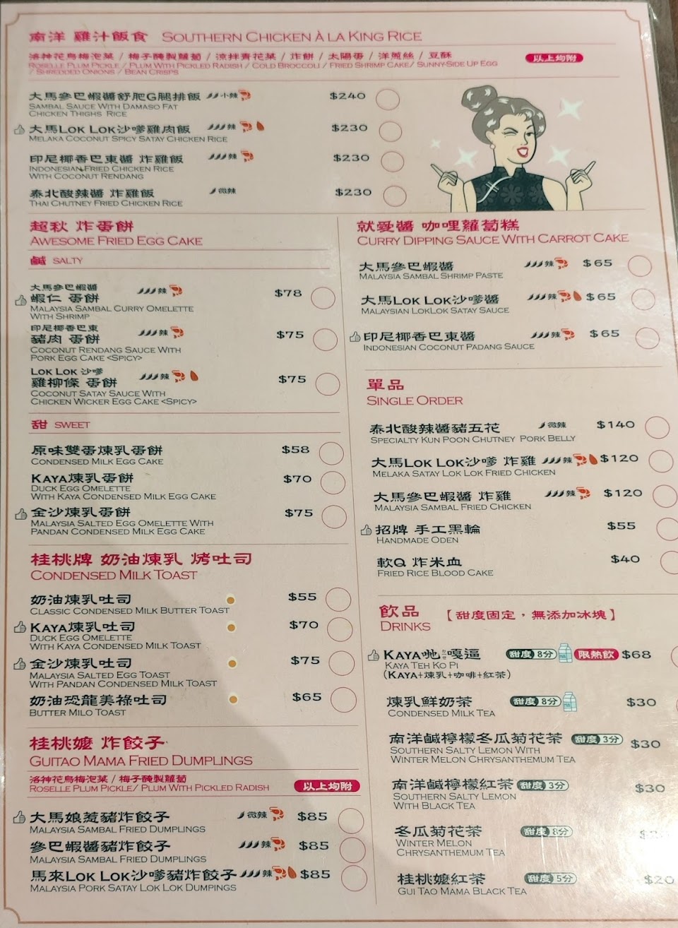 餐廳販售南洋鍋燒麵、炒粿條油麵、馬來娘惹肉醬飯、烤吐司、蛋餅、飲料等等
