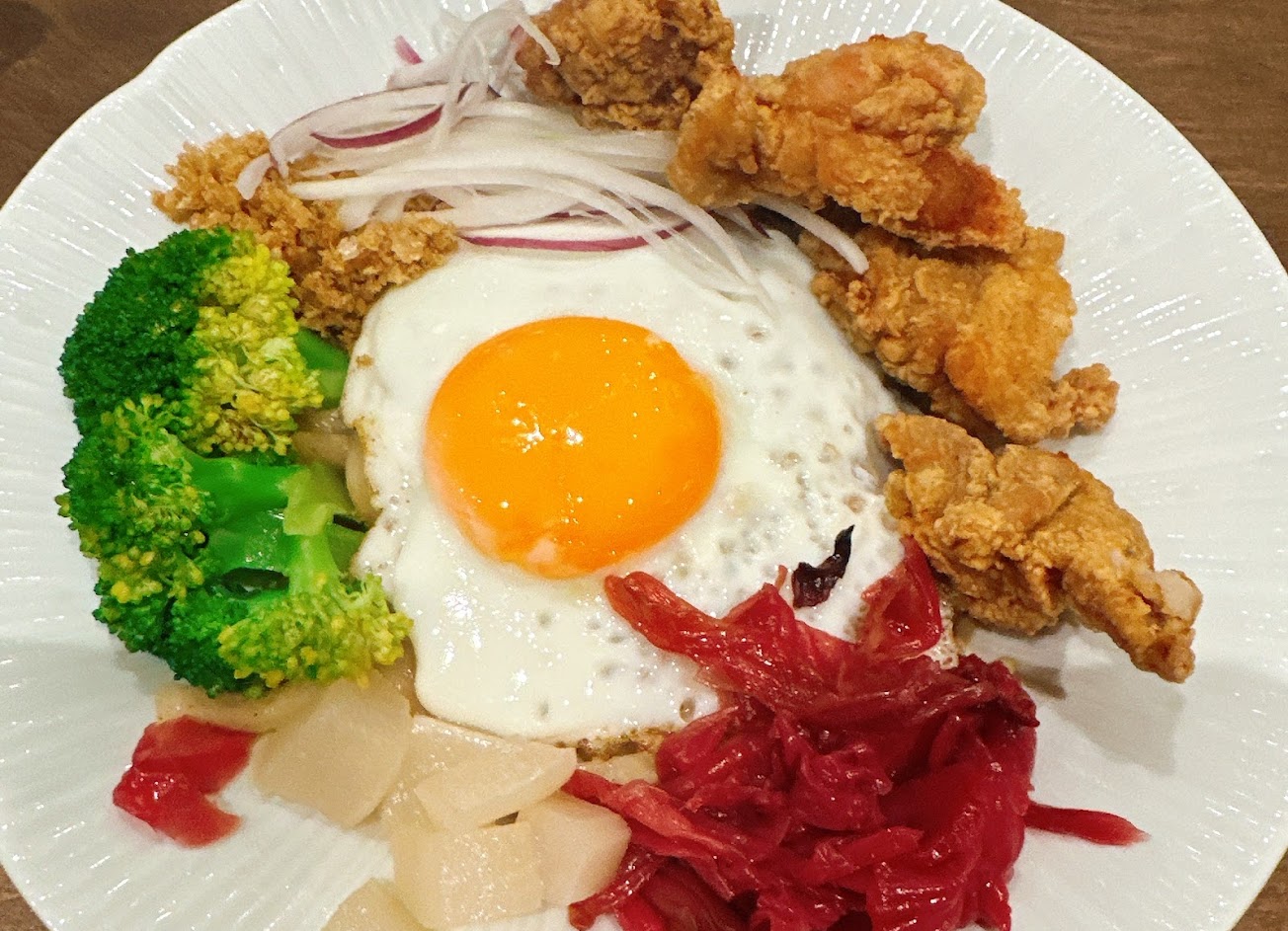 ——————分隔線——————— 餐點 印尼椰香巴東醬炸雞拌麵$200⭐️⭐️⭐️⭐️⭐️ 配料:洛神花烏梅泡菜、梅子醃製蘿蔔塊、涼拌花椰菜、太陽蛋、洋蔥絲、豆酥 擺盤很整齊乾淨,我個人很愛吃麵食,尤其是烏龍麵,烏龍麵很Q彈,炸雞有四大塊,雞肉肉質很嫩多汁,沒雞味!