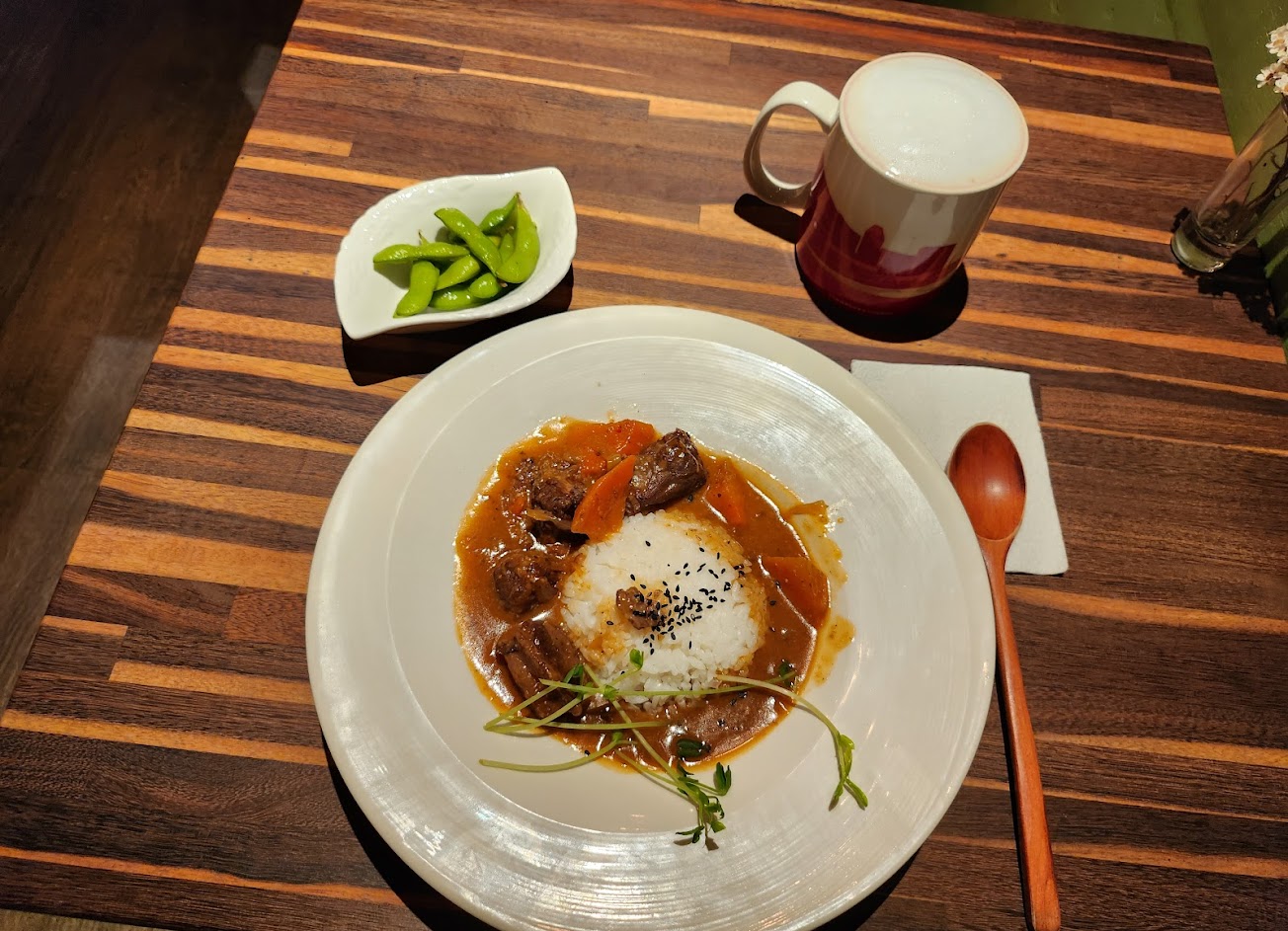 紅酒燉牛肉飯普通、朋友的奶油燉飯也還好,甜點如芒果、巧克力都還好,毛豆沒有調過味,但老闆人很好!