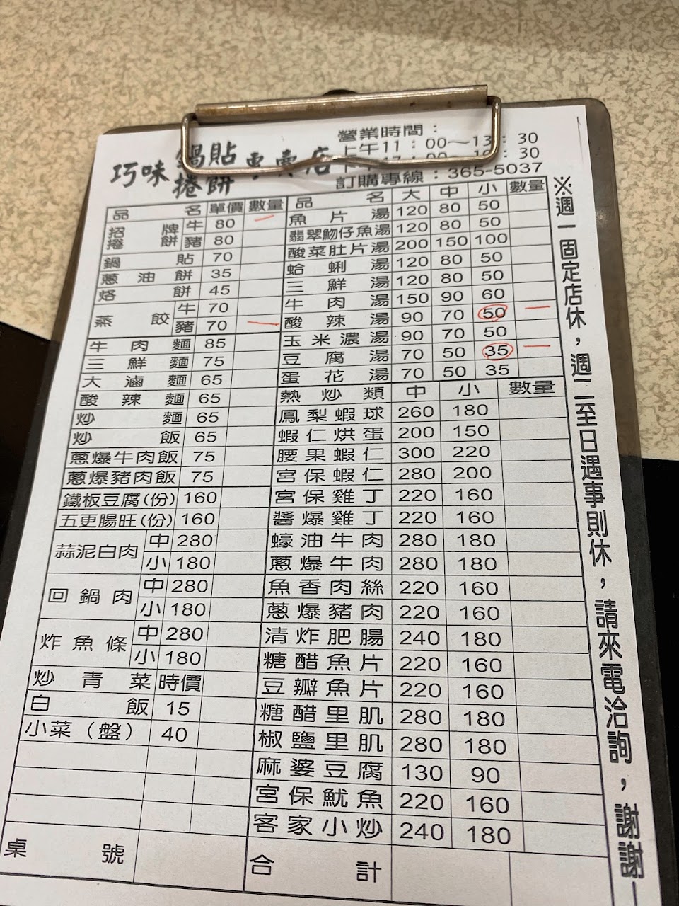 餐廳裝潢舊了點但看起來乾淨,點了鍋貼65+牛肉卷70+中酸辣60 上菜速度蠻快的,可惜鍋貼沒煎脆+捲餅不錯但肉有點少+酸辣料多但是不值60,是爸喜歡的外省口味,附近有車格,看到客人來打包的比較多。