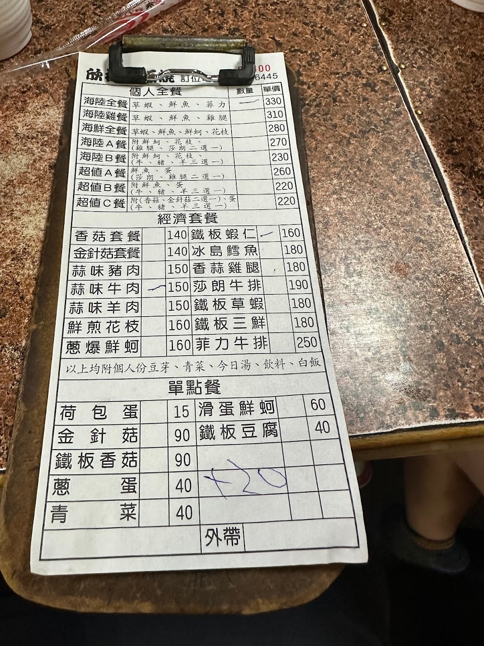 傳統口味的鐵板燒,內部設備舊舊的,飯和湯無限取用,價格在150元左右