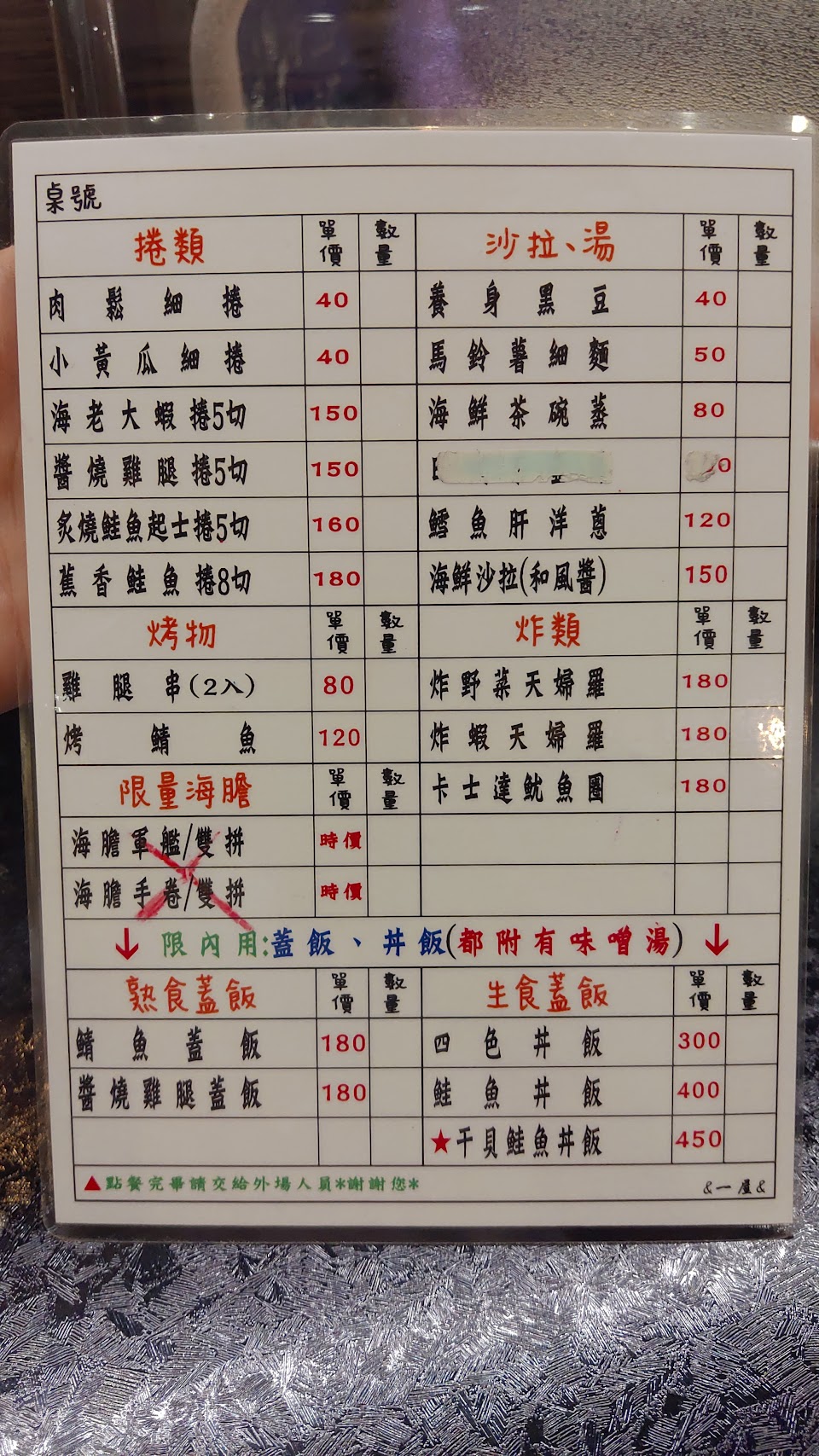 跟我們說沒跳號做餐點 我們離開時後面剛好也一組客人離開跟在我們後面 他們就在說你們不同桌 如果有點一樣的就會一起做 導致每桌都缺 他們還說做丼飯類的人 做完丼飯只會嘆氣